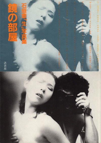Akira Ishigaki today is most known for his underground photo documents of Kinbaku rope bondage practitioners. Before most of those he published this personal "document" of romantic encounters in 1976/77. Nobuyoshi Araki comes to mind of course, with the settings, "poses," and more than occasional appearances of the photographer in his own art (though these photos really predate publications of Araki's similar work). All of the photos are taken in Love Hotels with one night stands - whether professionals or acquaintances they are enthusiastic participant models. Ishigaki documents the names and ages of the girlfriend/models as well as the dates of the encounters. Though most of the photos feature the model alone, the title of the book is derived from the photos where Ishigaki utilizes the Hotel mirrors (some are very large) to include himself as a voyeur participant. In these photos Ishigaki usually positions himself behind the nude model and his face is always obscured by his large camera as he looks through the viewfinder. This has the unsettling effect of identifying us the viewer as the voyeur-participant in his stead or alternatively turning himself into a voyeur-ghost hovering within the proceedings. — F.to: 21x30; pagg. 128; BN; rileg. brossura. Editore: Hama Shobo, Tokyo, 1982.