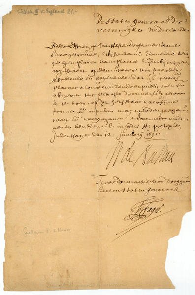 Folio. 1 p. In Dutch, to the Estates General, referring to an ordonnance forbidding the export of horses (Nader verbod tegens het uitvoeren van paarden na den vyand - Further prohibition of the export of horses to the enemy): "We send your honour a few copies of the ordonnance which we have received on the export of horses, approved and requesting, that you [.] have it published and spread at the locations where this is normally done [.]". With a further note by "Fr[ançois] Fagel" (secretary of the Estates General), referring the document to the Estates General. - Some loss to lower right corner (not touching text).