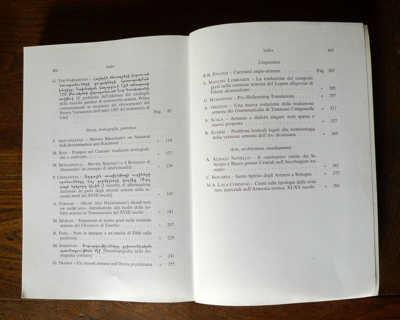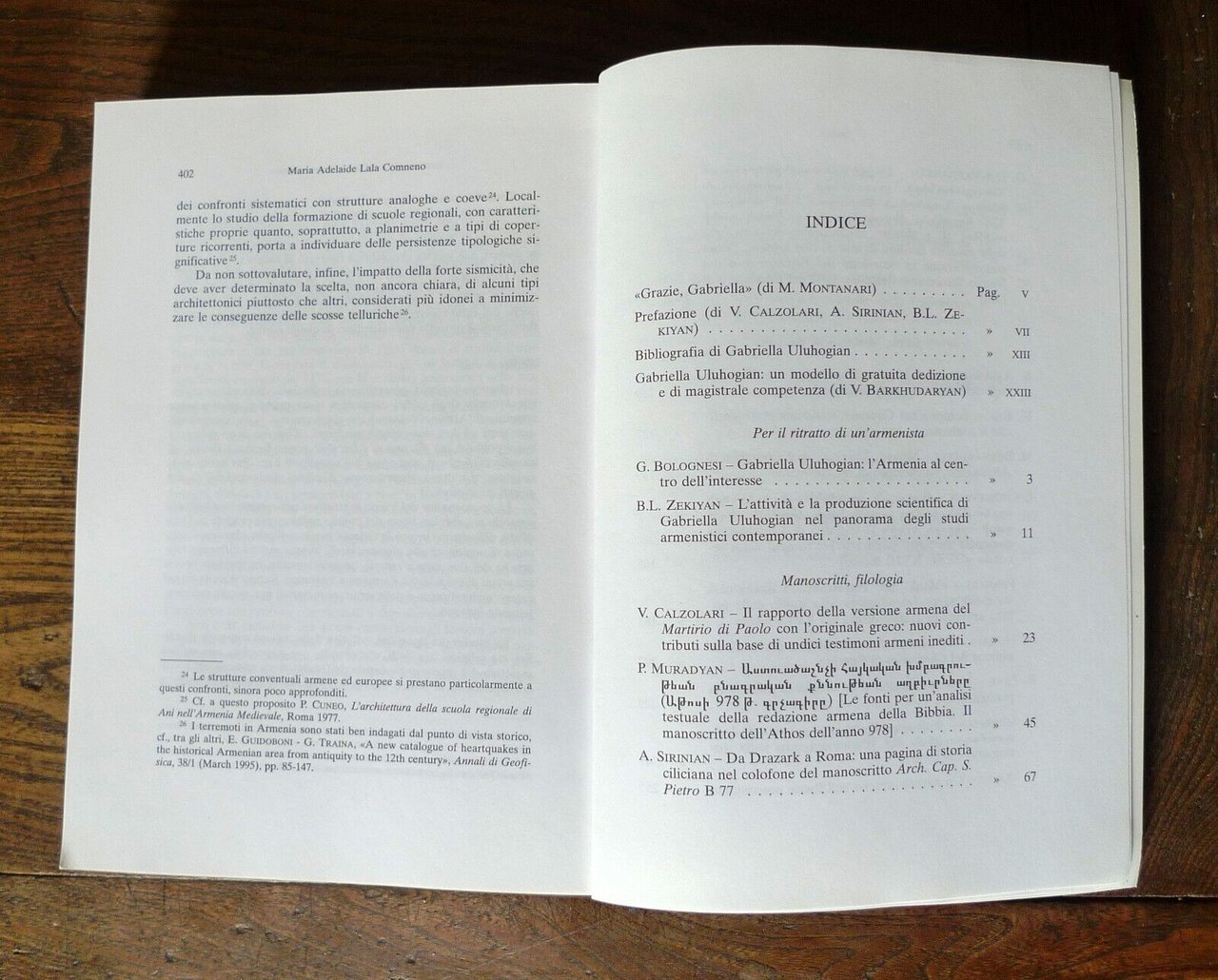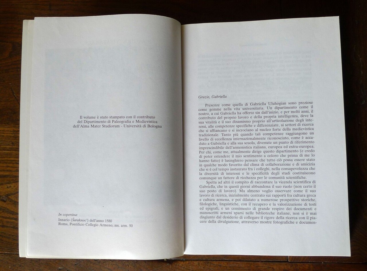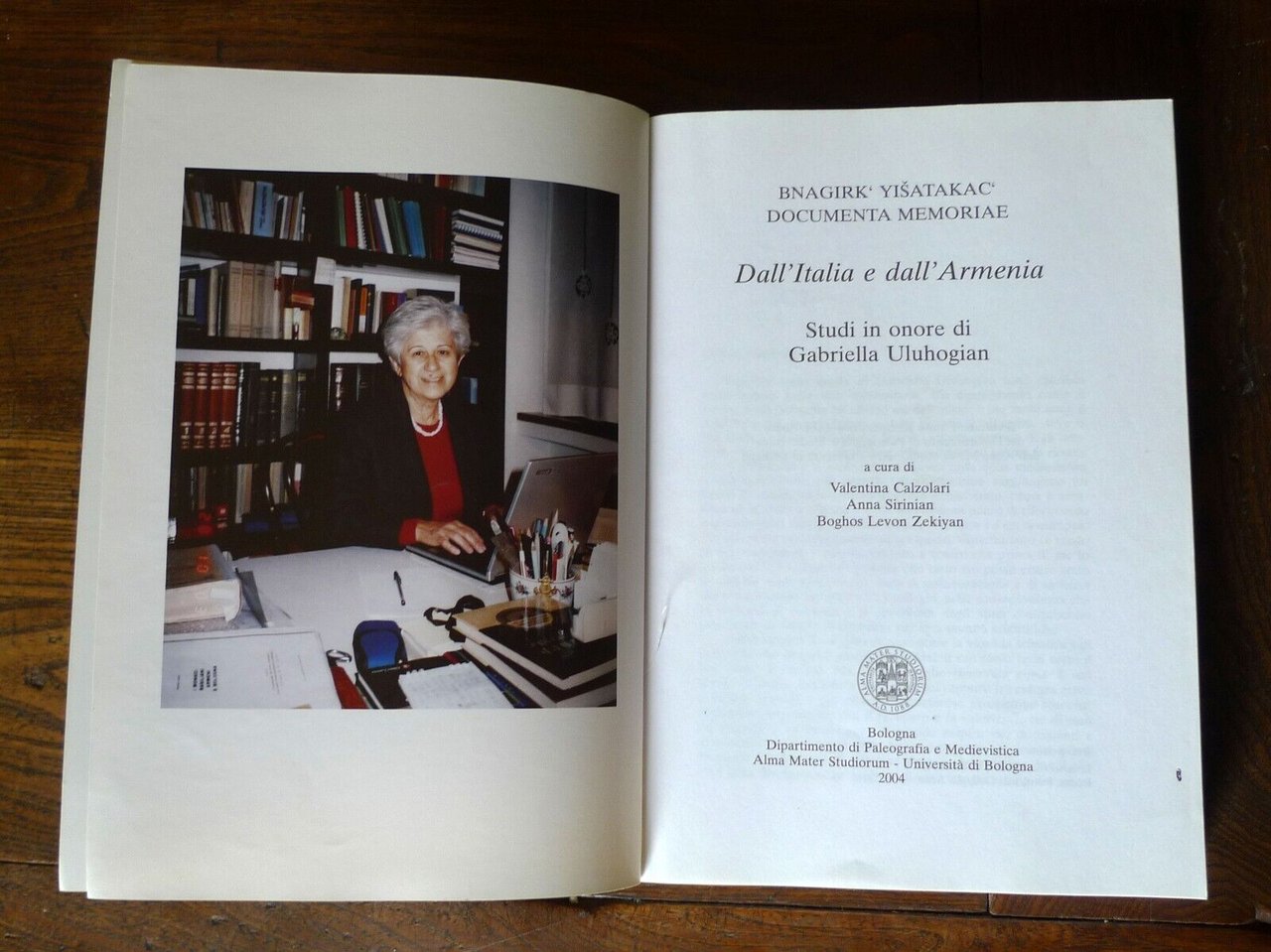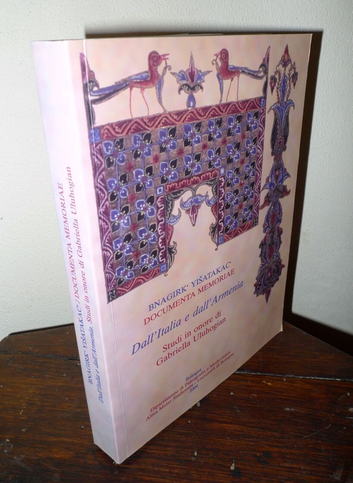 BNAGIRK' YIŠATAKACDOCUMENTA MEMORIAE.DALL'ITALIA E DALL'ARMENIA.Studi in onore di Gabriella Uluhogian.A cura di Valentina Calzolari, Anna Sirinian,Boghos Levon Zekiyan.Bologna, Dipartimento di Paleografia eMedievistica, Alma Mater Studiorum,Università di Bologna 2004,brossura, 24x17 cm., pp.XXVII-405,con un ritratto fotografico di Gabriella Uluhogianall'antiporta,alcune illustrazioni in bianco e nero,testi in italiano, armeno, inglese,peso: g.800