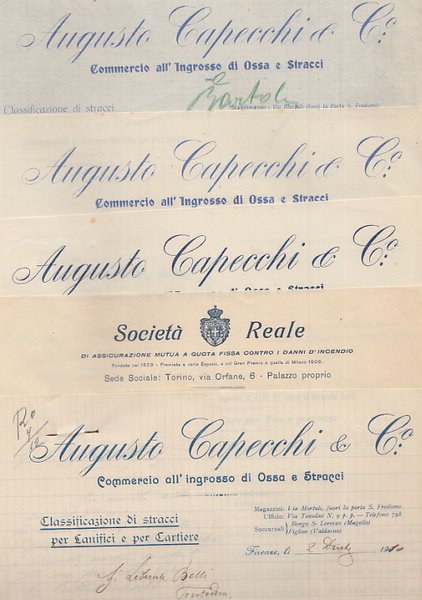 Fascicoli con 11 lettere la maggior parte delle quali su carta intestata della ditta Augusto Capecchi e C. di Firenze con succursali a Borgo San Lorenzo e Figline Valdarno. Oggetto delle stesse è un giusdizio di arbitrato tra Augusto Capecchi e Palmiro Bartoli quest'ultimo domicialiato alla Rotta di Pontedera. MOLTO BUONO