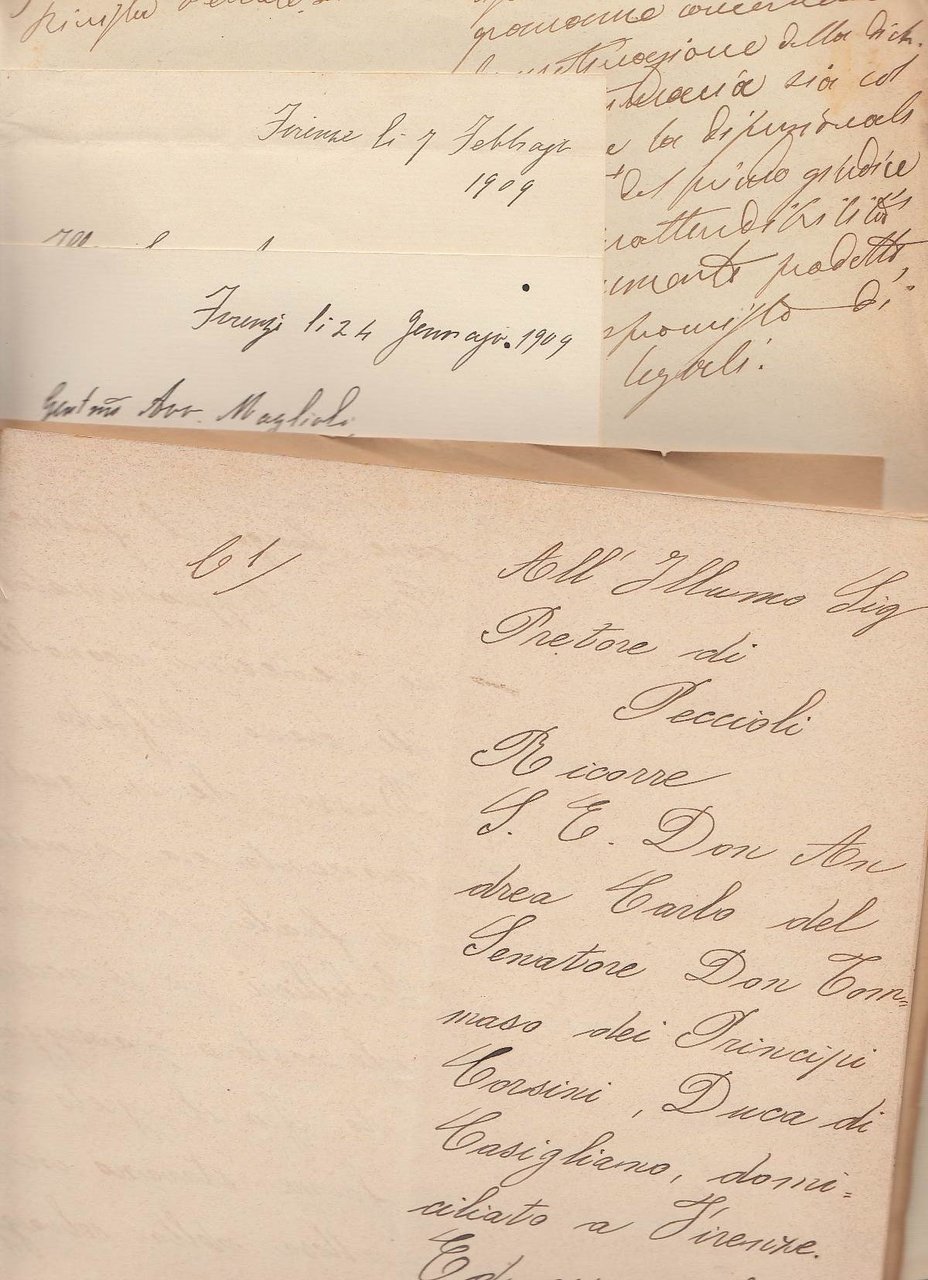 Documentazione Manoscritta Avente Ad Oggetto Una Questione Legale Tra Andrea Carlo Dei Principi Corsini Proprietario Della Tenuta Di Spedaletto Nel Comune Di Lajatico Contro Due Cacciatori Che Secondo Il Principe, Pur Senza Varcare I Limiti Della Tenuta,