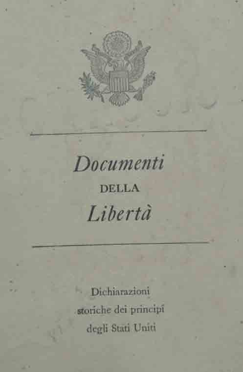 Documenti della libertà. Dichiarazioni storiche dei principi degli Stati Uniti, Ufficio Informazioni di Guerra degli Stati Uniti d’America, s.l. s.d. (1943?), pp. 73, cm 20, br. ed. Descrizione realizzata sulla base della prima di copertina. Timbro Omaggio alla prima di copertina. Alcune cifre annotate a biro al frontespizio, tracce d’uso, leggera ingiallitura della carta, minime fioriture, ma nel complesso ancora buona copia.