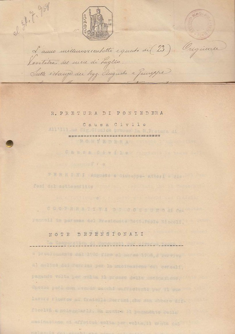Documenti Di Natura Giuridica Aventi Ad Oggetto Una Causa Commerciale Tra Ferrini Augusto E Giuseppe Contro Paolo Niccoli Come Presidente E Rappresentante La Cooperativa Di Consumo Di Capannoli. I Ferrini Risultavano Proprietari Del "Molino A Gas L'italia