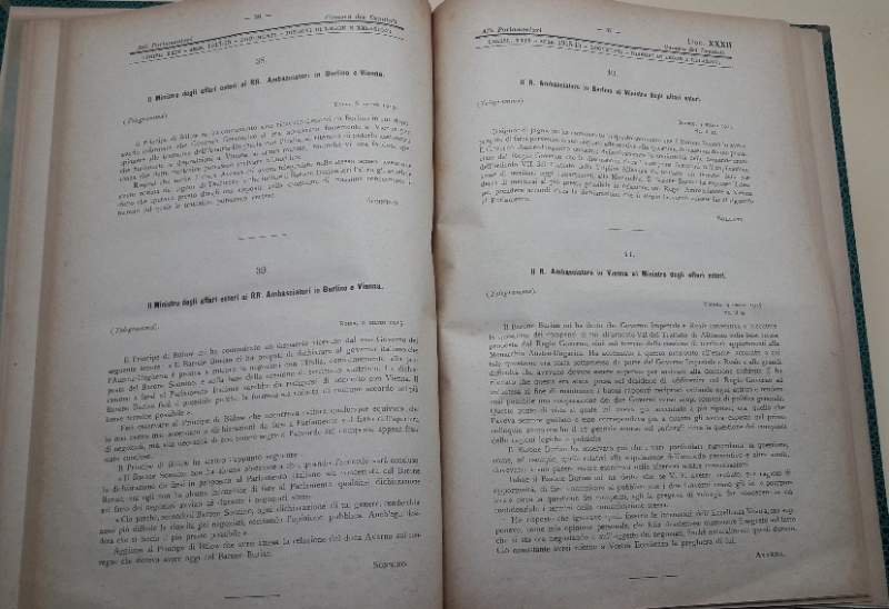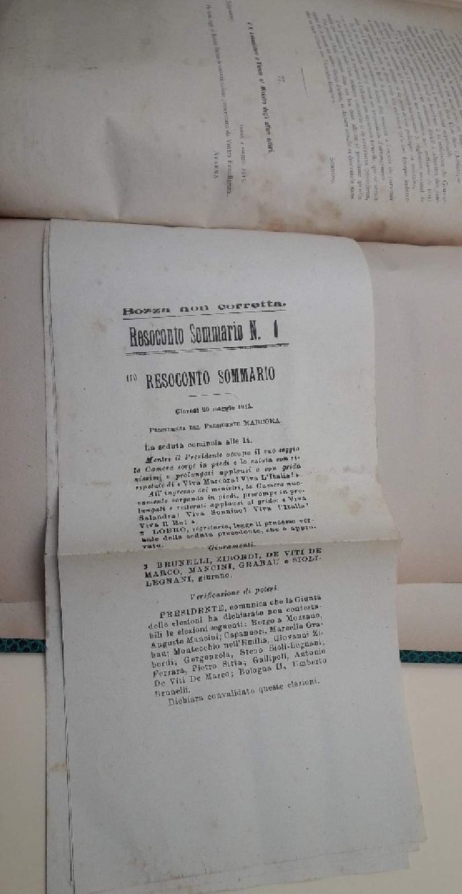 In 4', leg. mz. tela con tit. in oro al dorso, pp. 66 e 4 bozze dei resoconti dei lavori parlamentari(foto); atti parlamentari, Legislatura XXIV- sessione 1913-15-Camera dei Deputatio n. XXXII- documenti, Seduta del 20 Maggio 1915. Leg. in ottimo stato, cop. originale mantenuta, con alcuni residui di carta nella parte superiore, firma di appartenenza presumibilmente coeva nella parte inferiore, interno in buono stato , ordinarie bruniture e segni del tempo. ***Due to bureaucratic reasons, books dated over 70 years old cannot be immediately exported, please contact us before placing the order.***