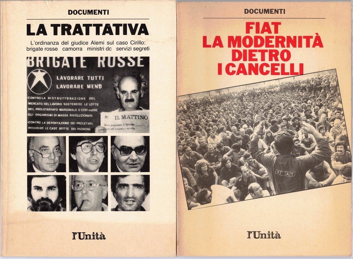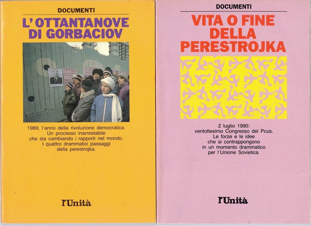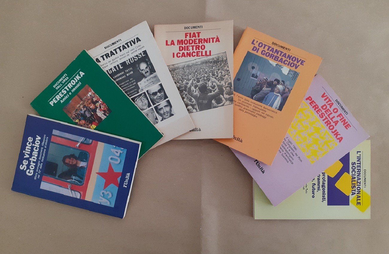 Il lotto comprende 7 supplementi monografici della serie Documenti allegati all’Unità, l’Unità (Editrice l’Unità S.p.A.), s.l. (ma stampati a Cles, presso la Nuova Stampa Mondadori) 1987-1990, 7 voll., pp. totali, cm 19, br. ed. Elenco delle monografie comprese nel lotto: Se vince Gorbaciov. Storia immagini documenti riflessioni nel 70° della rivoluzione d’ottobre, a cura di Carlo Ricchini et al., Editrice l’Unità, s.l. (ma stampato a Cles, presso la Nuova Stampa Mondadori) 1987, pp. 206, 12 c. di tavv. f.t. ill. b.n., cm 19, br. ed. (allegato al n. 259 del 1 novembre 1987 dell’Unità) – Giuseppe Boffa et al., Perestrojka. Amici e nemici, a cura della redazione iniziative editoriali dell’Unità, Editrice l’Unità, s.l. (ma stampato a Cles, presso la Nuova Stampa Mondadori) 1988, pp. 111, cm 19, br. ed. – Massimo D’Alema et al., La trattativa. L’ordinanza del giudice Alemi sul caso Cirillo: brigate rosse camorra ministri dc servizi segreti, a cura della redazione iniziative editoriali dell’Unità, Editrice l’Unità, s.l. (ma stampato a Cles, presso la Nuova Stampa Mondadori) 1988, pp. 127, cm 19, br. ed. – Fiat la modernità dietro i cancelli, a cura di Carlo Ricchini, Alberto Leiss e Luisa Melograni, l’Unità, s.l. (ma stampato a Cles, presso la Nuova Stampa Mondadori) 1989, pp. 127, cm 19, br. ed. (allegato al n. 27 del 2 febbraio 1989 dell’Unità) – L’Ottantanove di Gorbaciov, a cura di Adriano Guerra, l’Unità, s.l. (ma stampato a Cles, presso la Nuova Stampa Mondadori) 1989, pp. 253, cm 19, br. ed. (allegato al n. 280 del 28 novembre 1989 dell’Unità) – Vita o fine della perestroika, a cura del centro studi paesi dell’Europa centrale e orientale (Fondazione Istituto Gramsci) e della redazione iniziative editoriali dell’Unità, l’Unità, s.l. (ma stampato a Cles, presso la Nuova Stampa Mondadori) 1990, pp. 174, cm 19, br. ed. (allegato al n. 177 del 28 giugno 1990 dell’Unità) – L’Internazionale socialista. Storia, protagonisti, programmi, presente, futuro, a cura di Mario Telò, l’Unità, s.l. (ma stampato a Cles, presso la Nuova Stampa Mondadori) 1990, pp. 195, cm 19, br. ed. (allegato al n. 224 del 22 novembre 1990 dell’Unità). Indici. Se vince Gorbaciov. Storia immagini documenti riflessioni nel 70° della rivoluzione d’ottobre: G. Chiaromonte, Senza timore della storia – G. Boffa, Ottobre vicino e lontano – A. Guerra, Le mosse di una fortezza assediata – M. Ferrara, Krusciov, la svolta incompiuta – E. Roggi, Breznev, stagnazione e missili – G. Chiesa, Irrompe la seconda rivoluzione – Id., Il libro firmato Mikhail Serghevic Gorbaciov – S. Sergi, Mosca, perestrojka sugli schermi tv – U. Cerroni, Le parole d’attualità (nella politica) - J. Bufalini, Le parole d’attualità (nell’economia) – N. Smelev, Profitto, concorrenza, mercato: se le parole ci fanno paura per noi non c’è scampo – D. Bernardini, Protagonisti – J. Bufalini, Dal 1917 al 1987. Cronologia – Dizionario minimo – Pagine di quei giorni. Perestrojka. Amici e nemici: G. Boffa, Prefazione – N. Andreeva, Non posso transigere sui principi – I principi della perestroJka: carattere rivoluzionario del pensiero e dell’azione (articolo della Pravda) – M. Gorbaciov, Che cosa ci aspettiamo dalla Conferenza – A. Aganbeghjan, Il programma di ristrutturazione radicale – M. Antonov, Il frutto proibito dell’economicismo – G. Popov, Il meccanismo di freno viene dagli anni del culto – N. Shmeliov, Convertibilità e corso unico del rublo: due compiti immediati – B. Sergheev, Sì al rublo convertibile, ma niente fughe in avanti – Le tesi per la Conferenza del Pcus. La trattativa. L’ordinanza del giudice Alemi sul caso Cirillo (M. D’Alema, Tragico e grottesco – L. Violante, Uscite da questa palude – V. Vasile, L’ordinanza del Giudice Alemi: il patto dei vertici Dc con Cutolo e le Br – Personaggi (Antonio Gava, di U. Baduel – Raffaele Cutolo, di V. Faenza – Giovanni Senzani, di B. Miserendino). Fiat la modernità dietro i cancelli: A. Bassolino, Non è solo una storia operaia – Botta e risposta Romiti-Occhetto – A. Leiss, L. Paolozzi, Viaggio sul lato oscuro dell’Impresa – Discriminazione con nomi e cognomi. Dossier, a cura di M. Costa et al., G. Bosetti, Walter Molinaro, il valore di un no – E. Manca, Un ventenne: Non sono un uomo-Fiat, io sono mio – B. Mazzoni, Senza volto il primo che ha parlato – R. Carollo, Dal silenzio alla prima pagina – Il dibattito sui giornali – U. Baduel, I conti con il Grande Fratello – Un impero con più profitti e meno sudditi – D. Novelli, Dal vallettismo al rambismo, una veterocultura – Bibliografia sommaria su Fiat e dintorni. L’Ottantanove di Gorbaciov: A. Guerra, Gorbaciov e l’arte della politica – I quattro nodi della perestrojka 1. Economia e società, a cura di J. Bufalini. Interventi di Gorbaciov, Abalkin, Gordon, Zacharova 2. La democrazia, a cura di S. Pons. Interventi di Gorbaciov, Rizkov, Sacharov, Migranjan, Dilighenskij 3. Le nazionalità, a cura di M. Mura. Interventi di Gorbaciov, Kapto, Bromlej, Antonov e il programma del Fronte estone 4. I rapporti internazionali, a cura di L. Sestan. Interventi di Gorbaciv, Bezrukov, Shevardnazde – Il congresso del popolo (25 maggio – 9 giugno 1989). Vita o fine della perestroika: G. Vacca, Presentazione – Il partito (S. Pons, Il Pcus senza monopolio – Zajkov, Ligacev, Le posizioni di Piattaforma democratica. Conservatori allo scoperto – Attacco ai radicali, lettera del Ce – Sevarnadze, I rischi della scissione – Indietro non torniamo, risposta di Piattaforma democratica – Gorbacev, Niente frazioni, il ruolo del Pcus non si liquida) – Le istituzioni (F. Bettanin, Nuovi poteri e pericoli di disgregazione – Gorbacev, I miei poteri di presidente – Cambia la Costituzione: fine del partito unico e carica del presidente – Eltsin, La Repubblica russa è uno Stato sovrano… 