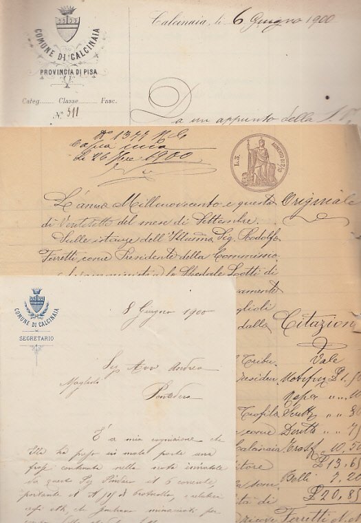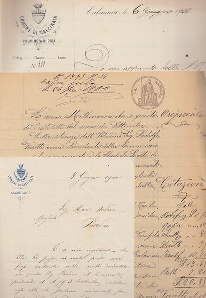 Fascicolo contenente vari documenti tra i quali, citazione in giudizio contro Giovacchino Arganini nella veste di sindaco e come tale rappresentante il comune di Calcinaia, due documenti su carta intestata del comune di Calcianaia, conto della retta ospedaliera e degl'interessi di mora dovuti dal Comune di Calcinaia, qualche appunto manoscritto.