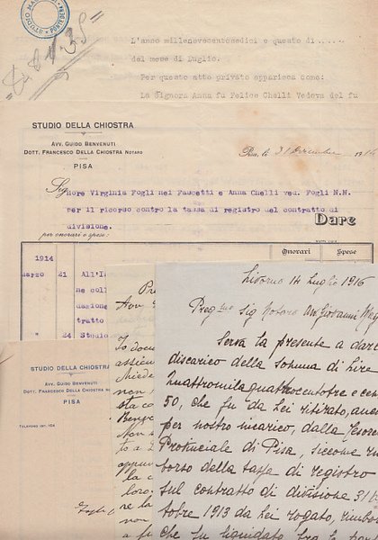 Documenti Manoscritti E Dattiloscritti Con Oggetto Una Questione Ereditaria Avente Come Soggetti Anna Chelli Vedova Fogli Di Pontedera Virginia Fogli Sposata Fascetti Assunta Magagnini Vedova Fogli