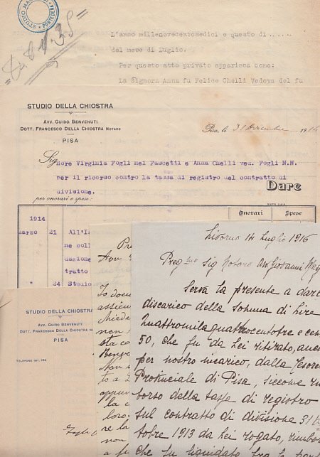 Fascicolo contenente vario materiale manoscritto e dattiloscritto inerente una questioereditaria della famiglia Fogli. La cartella contiene alcuni documenti dai quali si evince lo stato patrimoniale familiare (immobili a Pontedera, azienda commerciale di Calci, .), numerose lettere dstudio Della Chiostra di Pisa, lettere e documenti manoscritti vari.