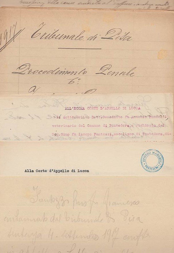 Fascicolo contenente vari documenti e dattiloscritti inerenti un curioso processo penale per frode in commercio contro un macellaio di Pontedera; il blocco contiene in particolar modo numerosi appunti e dattiloscritti attraverso i quali l'avvocato dell'imputato impostava la difesa presso la corte di Appello di Lucca.