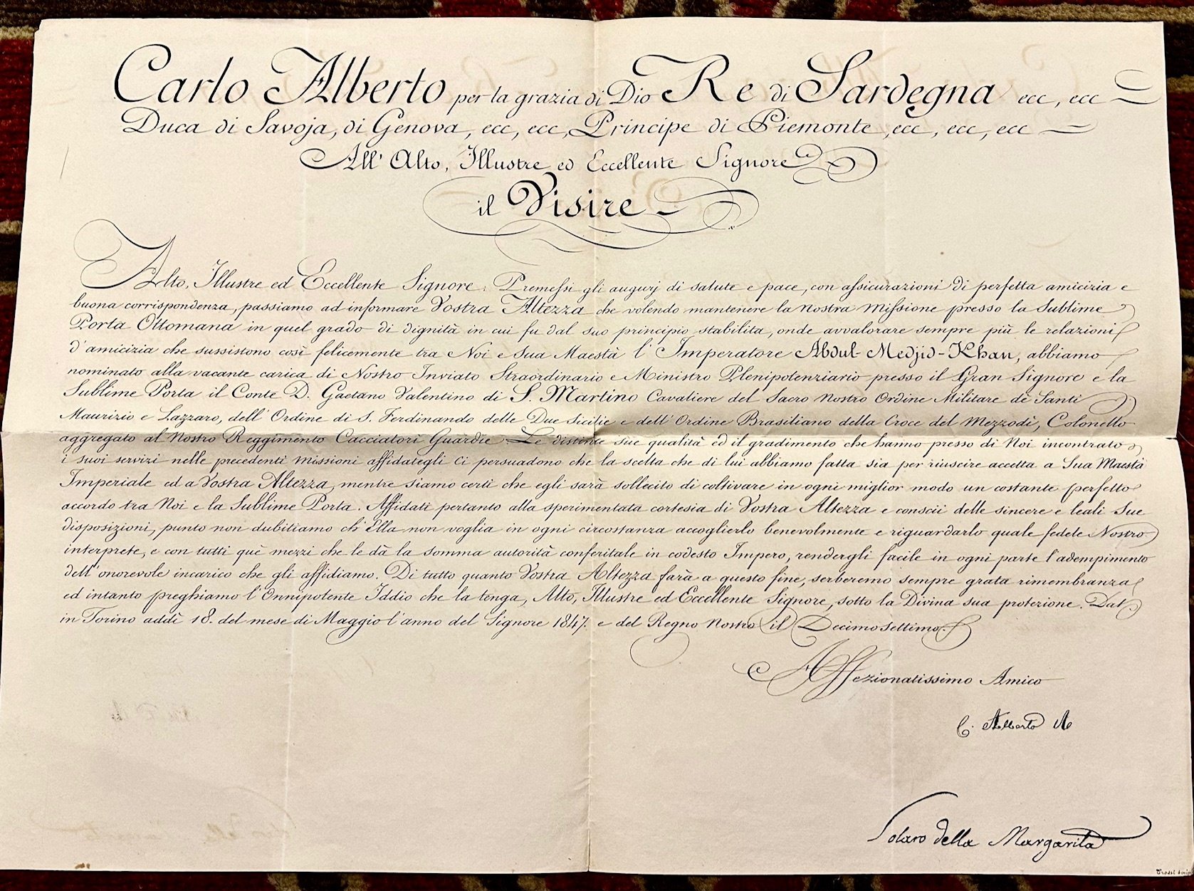 >1 pagina in-folio oblungo (mm 370x535) con sottoscrizione "affezionatissimo amico” e firma autografa “C. Alberto Re" e contofirmato da "Solaro della Margarita". Indirizzato al Sultano Abdul Medjid Khan, imperatore degli Ottomani. Il re lo informa ufficialmente di aver nominato alla carica di inviato straordinario e ministro plenipotenziario presso la corte ottomana il conte "D. Gaetano Valentino di S. Martino. Colonnello aggregato al Reggimento Cacciatori Guardie". In perfetto stato di conservazione.