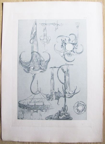 Splendida tavola pienamente Art Nouveau su carta Japon in morbide tonalità di grigio di A. M. Mucha. Librairie Centrale des Beaux Arts - Paris, 1902. Proveniente da Cartella contenitrice delle tavole decorative sciolte illustrate da Mucha. Tavola originale 33x46. Cartella non inclusa. Rara e in Ottimo stato. , Buono (Good)