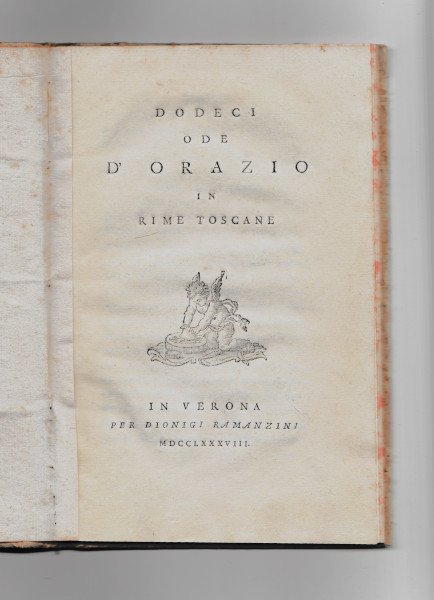 In 8vo (cm 20,5x13,5) cartonato. Pag. 43, incisione al frontespizio. Manca al Melzi e al Lancetti ma recensito dal NUOVO GIORNALE LETTERARIO N° XIV Marzo 1789 con elogio al traduttore Iannito degli Ascrei pseudonimo di Padre Antonio Cesari.