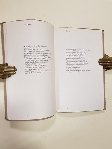 Traduzione di Roberto Fertonani e Emilio Picco.<BR>Il Bicordo / Quaderni di Poesia, 7.<BR>Edizione di 560 copie numerate di cui 60 contenenti un'acquaforte numerata e firmata dall'artista. Il nostro volume è l'esemplare n. 7.<BR>In 8° stretto; pp. 47 con 10 disegni a piena pagina nel testo; brossura editoriale; cucito.<BR>CONDIZIONI OTTIME (nome di un autore segnato a penna sul dorso).<BR>Testo tedesco a fronte.