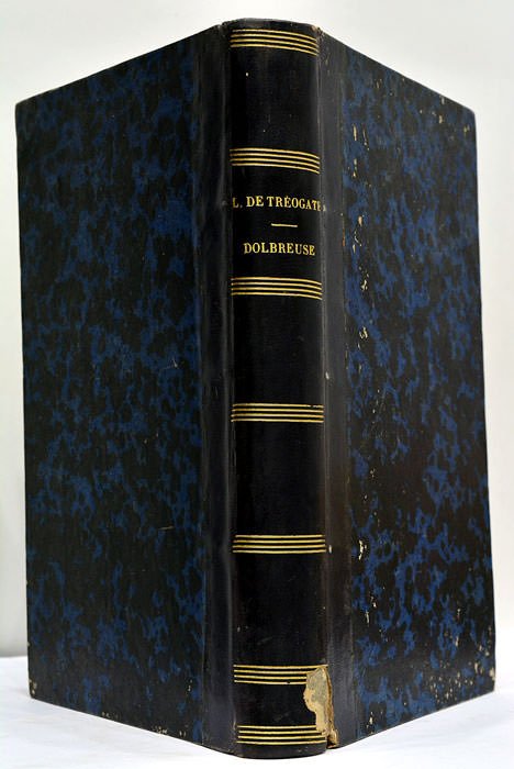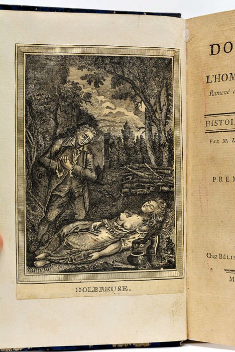 2 parties en 1 volume. frontispice. VIII. 120 pages. et frontispice. 128 pages. (21x13 Cm). Demi-veau bleu. Dos lisse orné de filets dorés. Accroc au bas du dos. Plats légèrement frottés. L'un des principaux ouvrages du littérateur breton Joseph Marie Loaisel de Tréogate, qui est parfois cité comme l'un des meilleurs représentants de la vague romanesque. Ce récit bâti autour d'une intrigue sentimentale tortueuse, est illustré de deux remarquables gravures placées en frontispice. La première est saisissante: Dolbreuse est à genoux devant un cadavre, dans un paysage nocturne de forêts et de ruines. Frontispice remontés à l'époque de la reliure. Taches et rousseurs éparses. Assez bon exemplaire sur papier fort.