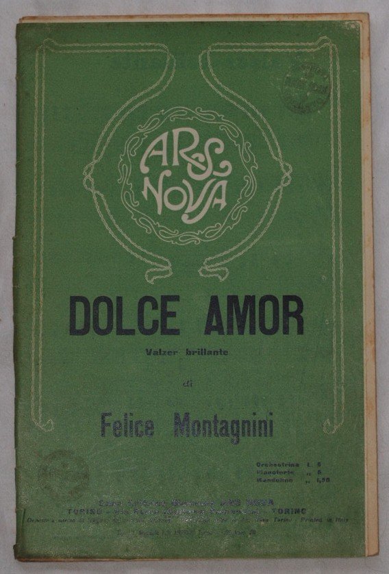 In 8. cm 27,5x18. pp 24. partitura completa per orchestra del 1929 di una canzone.<BR>Caratteristica copertina illustrata d'epoca. Ex libris sulla copertina. In buone condizioni; usure al dorso e copertina quasi staccata. a complete score for orchestra of 1929. Carachteristic decorated cover of that period. Ex libris in the cover. In good conditions; worn spine and plate almost detached.