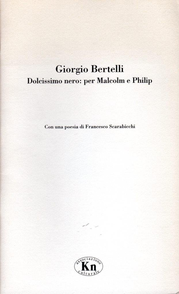 Dolcissimo nero: per Malcom e Philip, prima edizione febbraio 1996, formato 13 x 21.<BR>Copertina morbida di colore bianco con titoli in nero al piatto anteriore.All'interno una poesia di Francesco Scarabicchi e alcune tavole illustrate in b/n. <BR>Ottime condizioni.