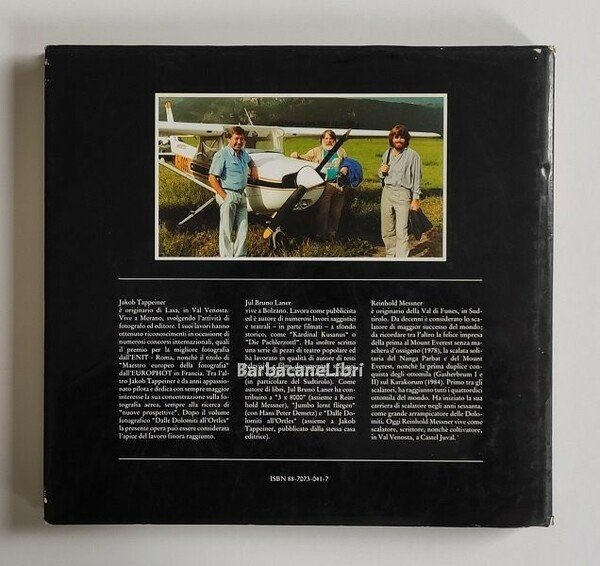 Questo libro propone un diverso approccio a queste famosissime montagne nel cuore dell'Europa: le foto aeree di Jakob Tappeiner ci mostrano il mondo alpino nelle sue diverse sfaccettature: selvaggio e inaccessibile, morbido ed invitante. Jul Bruno Laner segue la storia delle Dolomiti, dalle loro origini, attraverso il vivace mutare delle diverse culture, fino al paradiso del tempo libero nella sua espressione economica. Reinhold Messner ci illustra attraverso l'occhio del contemporaneo impegnato e sorpreso e dello scalatore di successo, le minacce e le chances di questa montagna, i margini di gioco per gli uomini che se ne lasciano entusiasmare. Tre vie per tre prospettive: realtà, mito e passione.