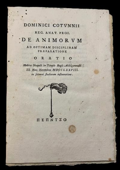 In 4° piccolo; 38, (2) pp. Prima ed ultima carta bianca. Legatura in cartoncino posteriore. Alcuni piccoli forellini di tarlo, due tunnel di tarlo abilmente restaurati al margine esterno bianco di alcune carte, ininfluenti e per il resto in buone condizioni di conservazione. Immagine di mano che sorregge un pendolo al frontespizio. Prima assai rara edizione, stampata a Napoli, di questo dissertazione sulla formazione medica, del grande medico, anatomista e chirurgo, originario di Ruvo di Puglia (Bari), Domenico Cotugno (Ruvo di Puglia, 29 gennaio 1736 Napoli, 6 ottobre 1822). Cotugno, 29 anni prima della scoperta di Jenner che cambierà il mondo della medicina, sulla base di dirette e numerosissime osservazioni cercò di analizzare la natura del vaiolo arrivando a considerare le lesioni da esso provocate, solo esterne e non anche viscerali. Cotugno fu uno dei medici più celebri e geniali del suo tempo ed operò, principalmente, a Napoli anche se fu socio di numerosissime accademie estere. "Domenico Cotugno fu protagonista di importanti scoperte neurologiche, grazie a un intensa attività clinica e anatomica, e fin dall inizio mostrò i suoi interessi per l anatomia sottile, cioè la ricerca dei piccoli e nascosti meccanismi che compongono il nostro organismo. In tutte le sue indagini egli seguì il metodo indicato nella sua prima opera: mostrare la natura delle cose così come gli era apparsa non una o due volte, ma centinaia di volte, nell esame dei cadaveri". Scrisse su svariati argomenti e fu un fine pensatore. "Secondo Benedetto Croce, Cotugno potrebbe essere stato il vero autore del celebre trattato Delle virtù e dei premi (il secondo del suo genere dopo Dei delitti e delle pene di Cesare Beccaria) che, uscito anonimo nel 1766, fu ristampato l'anno seguente, anche in francese, recando come autore il giurista aquilano, Giacinto Dragonetti e a questi sempre attribuito". Il Garrison-Morton, 1382, scrive che Cotugno "was the first to describe the fluid surrounding the spinal cord and to suggest that it was in continuity with the ventricular and cerebral subarachnoid fluids. However, his concept of the cerebral and spinal fluid, which is the beginning of its modern physiology, remained in obscurity until rediscovery by Magendie some 60 years later". Rara prima edizione. Rif. Bibl.: Assente in tutte le bibliografie consultate a parte, l'ICCU IT\ICCU\BA1E\013964 e IT\ICCU\LIAE\040519.