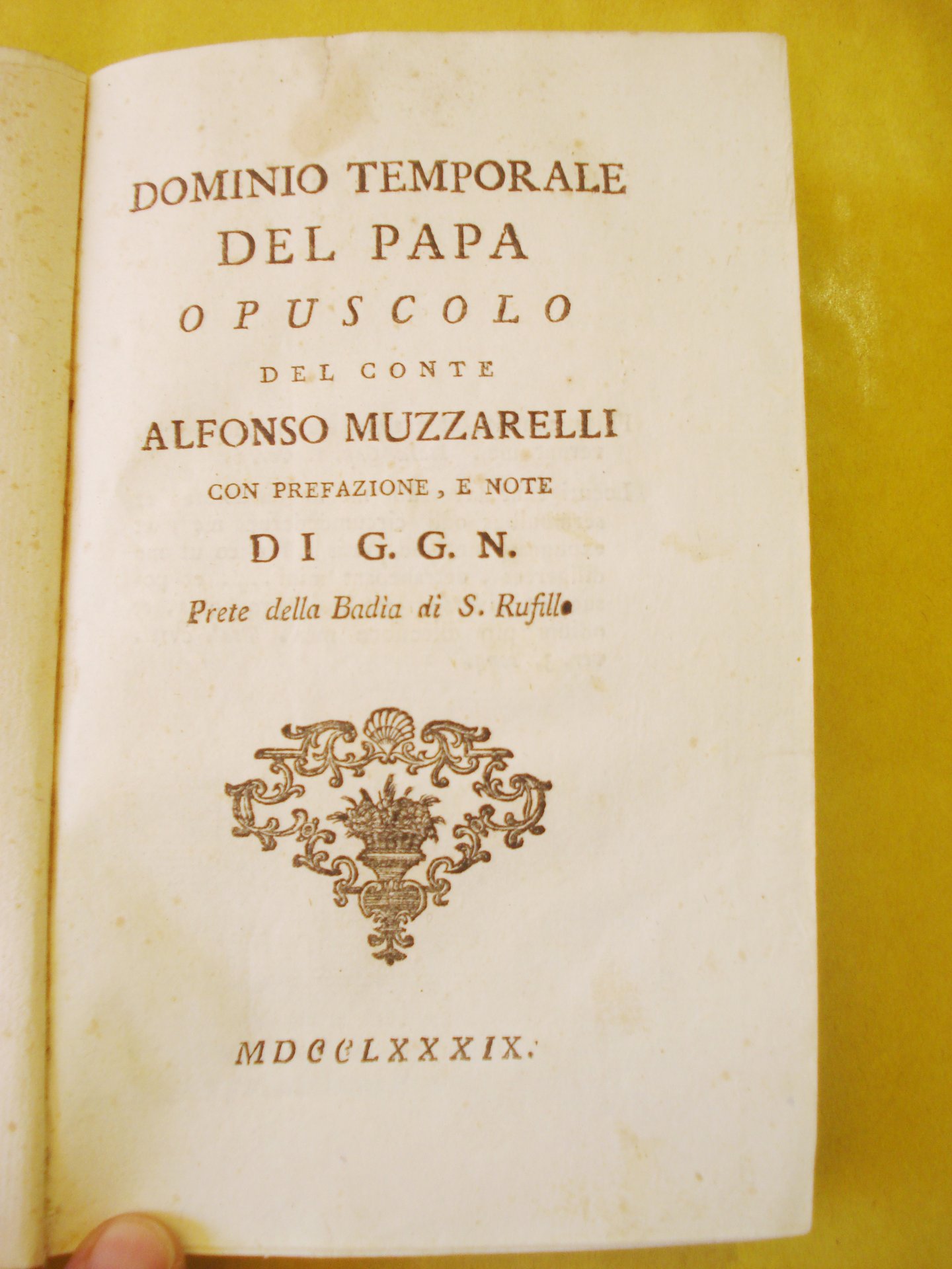 DOMINIO TEMPORALE DEL PAPA: OPUSCOLO DEL CONTE ALFONSO MUZZARELLI con prefazione e note di G.G.N. prete della Badia di S. Ruffillo., MDCCLXXXIX.