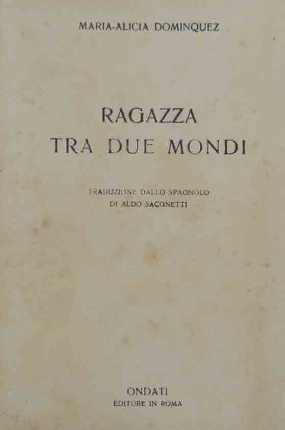 Maria Alicia Dominquez, Ragazza tra due mondi, traduzione dallo spagnolo di Aldo Scagnetti, Ondati Editore, Roma 1942, pp. 156, cm 20, br. ed. con sovraccoperta. Collana I romanzi della cicogna, n. 4. Alla quarta di copertina, timbro: Aumento 25 per cento – spese di trasporto. Lievi tracce d’uso, uno strappetto senza mancanze alla sovraccoperta, minime fioriture, per il resto buona copia.