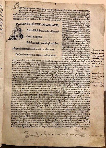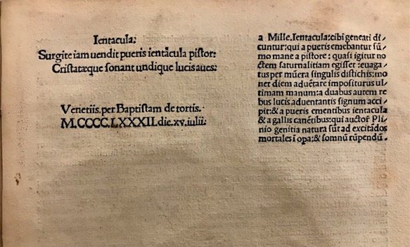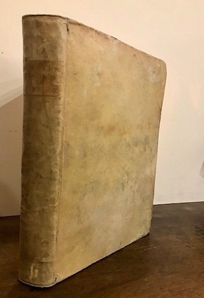 Folio (cm. 27,5), 198 cc.nn. Legatura settecentesca in pergamena rigida con titolo oro su tassello dipinto al ds. Tagli colorati. Lunga nota di possesso, datata 1600, al recto della prima carta. Due capilettera anticamente rubricati in nero. Molti epigrammi numerati da mano coeva ed alcune altre antiche glosse marginali. Qualche piccolo percorso di tarlo, perlopiù risarcito, al margine bianco inferiore (lontano dal testo). Lievi arrossature ed aloni, di cui uno più pronunciato all’angolo inferiore delle ultime dodici carte. Nel complesso, esemplare genuino ed in più che buono stato di conservazione. Il commento all’opera di Marziale dell’umanista veronese Domizio Calderini fu pubblicato per la prima volta a Roma nel 1474, mentre la prima edizione completa del testo del poeta epigrammista apparse postuma a Venezia nel 1480 e quindi nel 1482. Questo commento ebbe enorme successo tanto che fu pubblicato ripetutamente durante i due secoli successivi.Cfr. Goff, M-306; Hain, 10816.