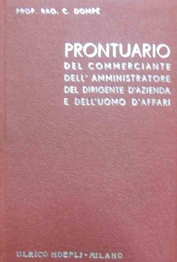 Carlo Dompé, Prontuario del commerciante, dell’amministratore, del dirigente d’azienda e dell’uomo d’affari, Editore Ulrico Hoepli, Milano 1943, quarta ed. aumentata ed aggiornata, pp. XVI, 894, br. ed. in similpelle con titoli al dorso e al piatto anteriore, decorazione a impressione al piatto posteriore e custodia in cartoncino ed. Piccolo timbro d’appartenenza all’ultima carta di testo. Lievi tracce d’uso e sgualciture, minime fioriture, leggera brunitura della carta, per il resto ben conservato.