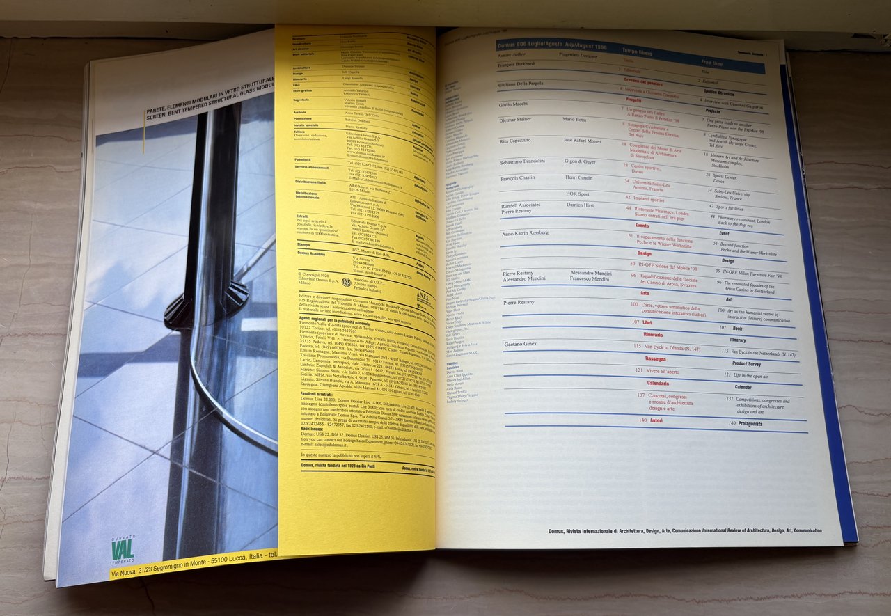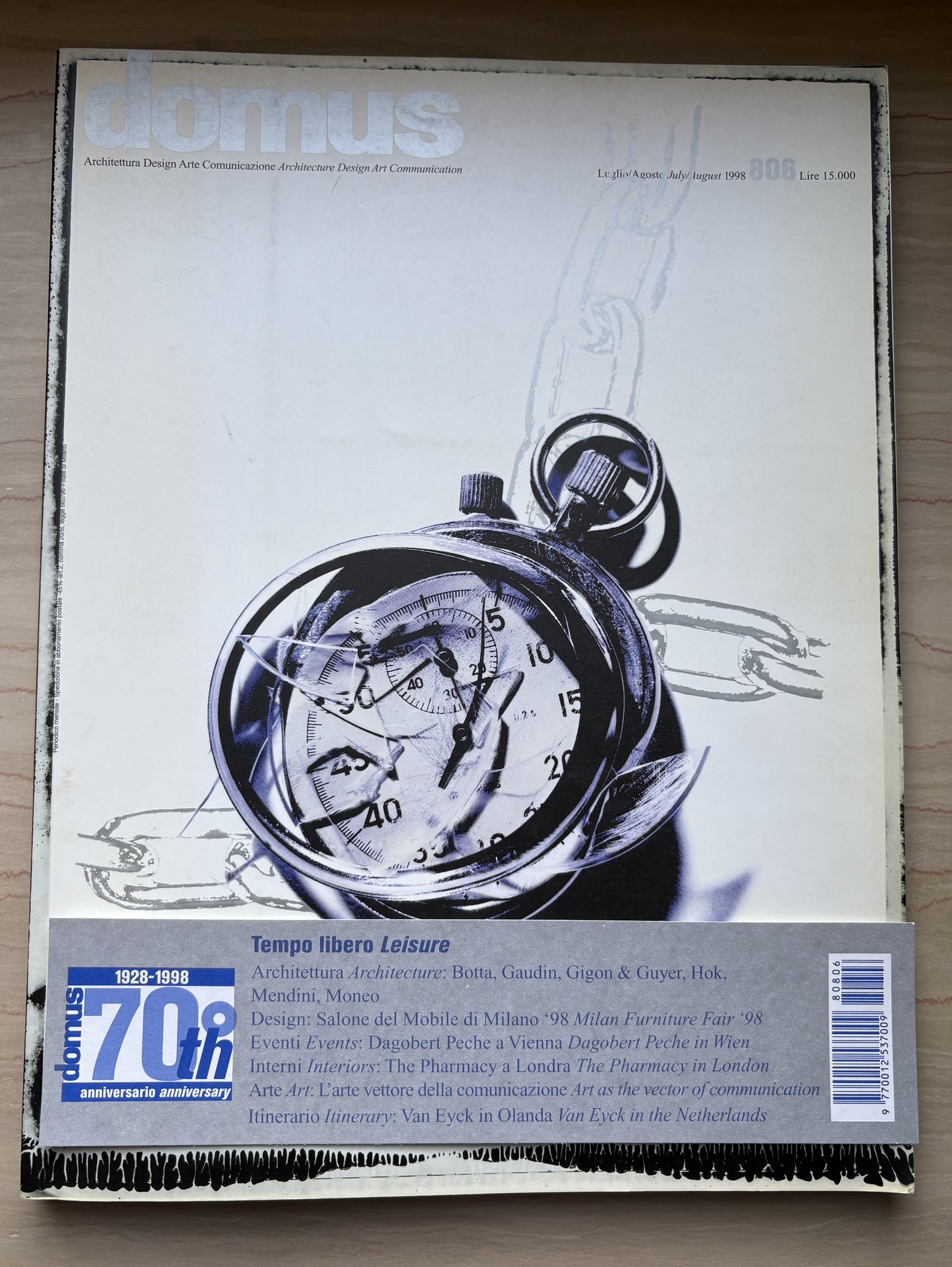 - Novecento periodici, arte, Rafael Vargas, architettura, Mario Botta Sinagoga Cymbalista e Centro della Eredità Ebrai, Damien Hirst Ristorante Pharmacy Londra, Alessandro Mendini Francesco Mendini Riqualificazione delle f, architettura degli interni, design, Salone del mobile Milano 1998, François Burkhardt, grafica, Giuseppe Basile, Tempo libero, domus N. 806 Luglio/Agosto July/August 1998
