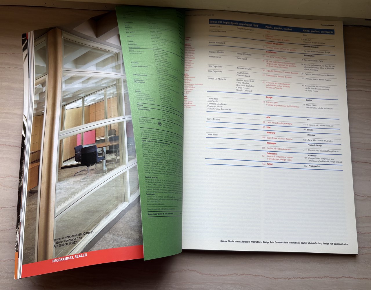 • Novecento periodici, arte, fotografia, Manuel Laval, architettura, Bernard Tschumi Parc de la Villette Parigi, Zaha Hadid FL one padiglione informativo per il Landesgartens, architettura degli interni, design, Fiera Milano 1999, Rassegna cucine ed elettrodomestici, François Burkhardt, grafica, Giuseppe Basile, parchi, giardini, cimiteri, domus N. 817 Luglio/Agosto July/August 1999