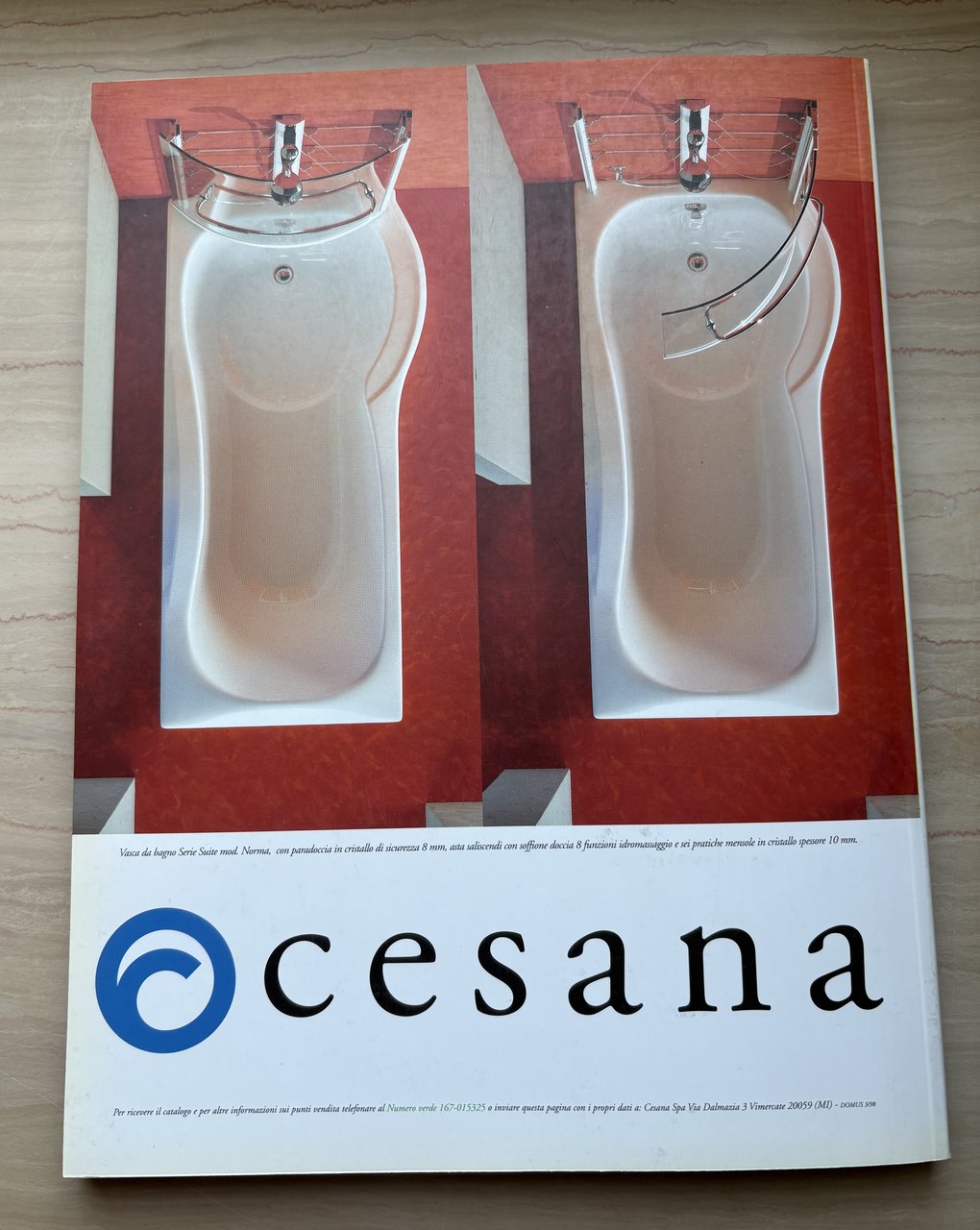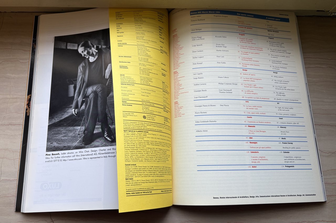 I ed. della rivista mensile: marzo 1998 numero 802 - Uno spazio comune A common Space (Via Achille Grandi 5/7, Rozzano - Milano). Testi in italiano/inglese. IV/(90)+XVIII Schede Bagno/Bathroom files+(2)+136 anche ripiegate=246/brossura satinata (La Copertina/ The Cover: Ramak Fazel, Uno spazio comune/A common Space). Illustrazioni in nero, b/n e a colori. Grafica/Graphics: Giuseppe Basile. Conservato il cartoncino editoriale con i titoli più rilevanti del numero. Stato buono (leggera usura della copertina ai margini - volume nel complesso leggermente brunto).