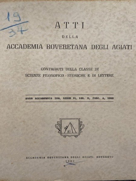 <p>CODICE 190 SCATOLA 1 ATTI DELLA ACCADEMIA ROVERETANA DEGLI AGIATI 1962 PAG 222</p>,