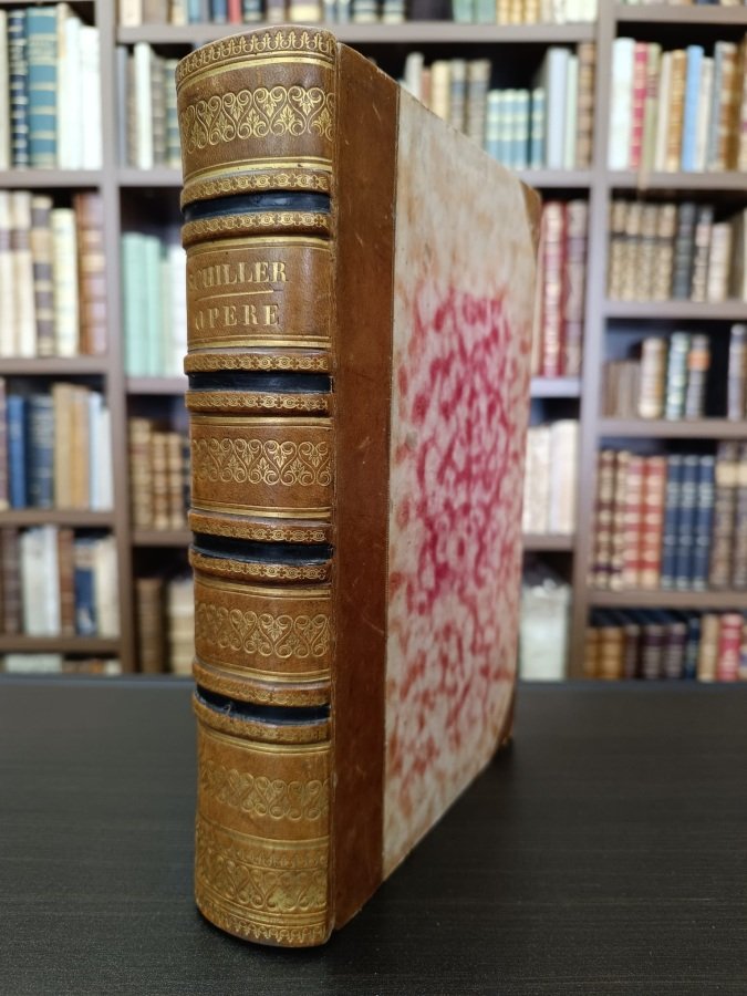 3 volumi in 1 in-8° (cm. 26,2), bella legatura coeva in mezza pelle nocciola ad angoli, dorso a doppi nervi con titolo, filetti ed eleganti fregi in oro ai comparti, filetti in nero tra le nervature (lievi tracce d'uso), labbri ornati in oro, risguardi in carta ornata; pp. [4] 340, 245 [1b], 225 [1b] in stato molto buono (lievi fioriture). Ciascuna opera con antiporta disegnato da Hayez e finemente inciso in rame da Gandini, tranne per quello per il Guglielmo Tell che è inciso da Caterina Piotti Pirola; una vignetta ad ogni frontespizio sempre disegnata da Hayez ed incisa in rame da Sacchi il primo e da Ratti e Achille gli ultimi due. Testi interamente inquadrati da eleganti cornici ornate, graziosi testatine, capilettera e finalini. Belle ed accurate traduzioni in lingua italiana delle opere del grande drammaturgo tedesco a cura di Andrea Maffei (1798-1885), librettista e drammaturgo, a cui va il merito di aver contribuito a far conoscere e gustare agli Italiani molti capolavori della lirica transalpina. Collana «Opere edite ed inedite del cavalier Andrea Maffei». Antica firma di possesso alla prima carta bianca. Esemplare molto buono. (NH1)
