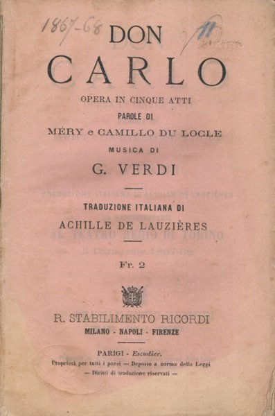 Libretto d’opera. Teatro Comunale di Bologna, Autunno 1867. Elenco dei personaggi completo del nome degli interpreti tra cui Teresina Stolz, Antonietta Fricci Neri Baraldi, Antonio Cotogni e Giorgio Stigelli. Si tratta della prima rappresentazione italiana del Don Carlo nella prima versione in cinque atti. Sotto la guida del maestro Angelo Mariani, la prima italiana del Don Carlo ottenne un grande successo al Teatro Comunale di Bologna.