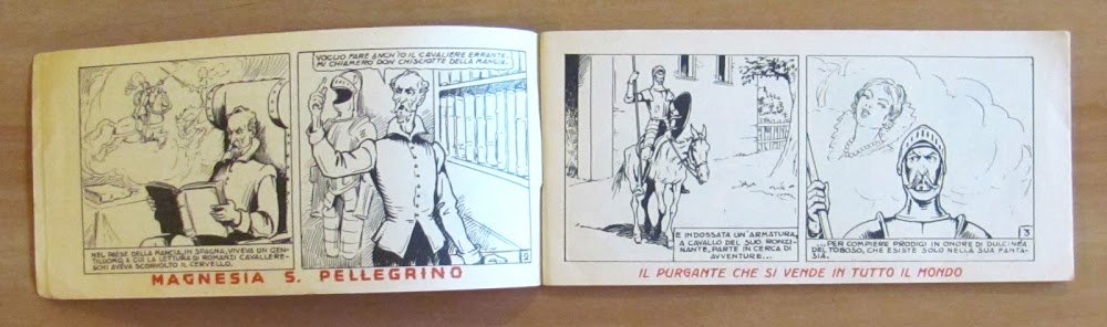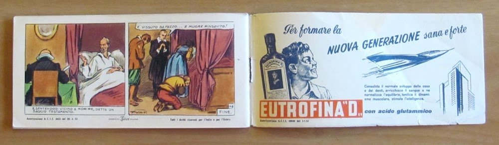 Illustrazioni a fumetti in b/n e a colori, a pagine alterne, di Domenico Natoli. Editore Magnesia San Pellegrino, 1953. Brossura editoriale con minime tracce del tempo alle copertine. Interno freschissimo. 18x7; pp.48. Rara striscia originale in Ottimo stato. , Ottimo (Fine)