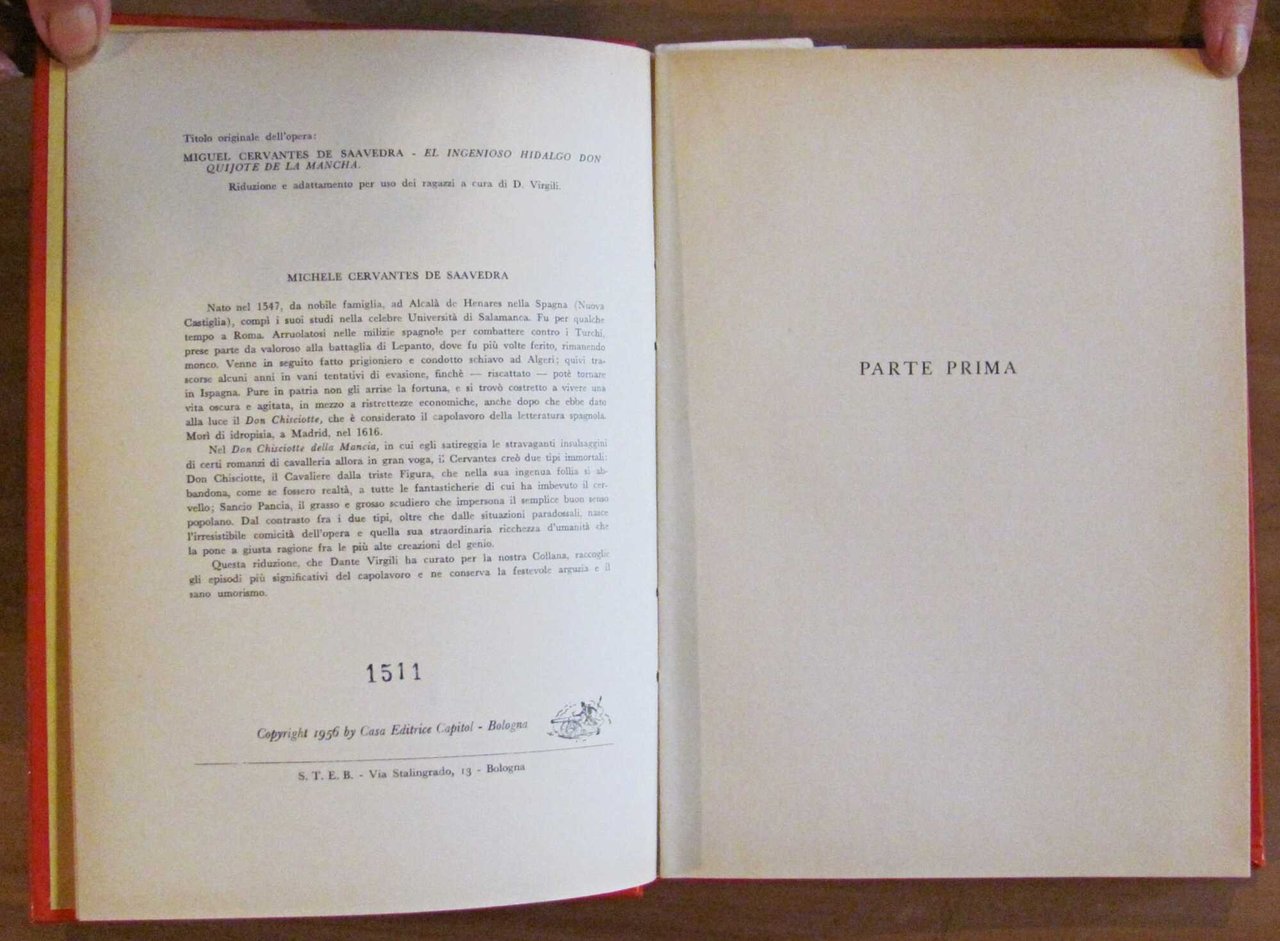 Riduzione e adattamento per uso dei ragazzi a cura di Dante Virgili. Don Chisciotte della Mancia. 4 tavole a colori f.t. di F. Baldi. Ed. Capitol - Bologna, 1956. Cartonato editoriale con copertine imbottite. 18x25; pp.168. Ottimo stato. , Molto buono (Very Good)