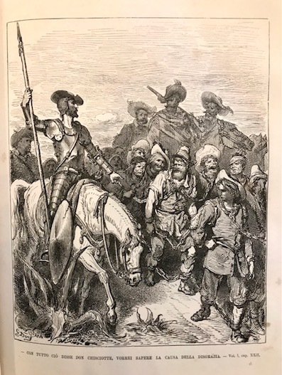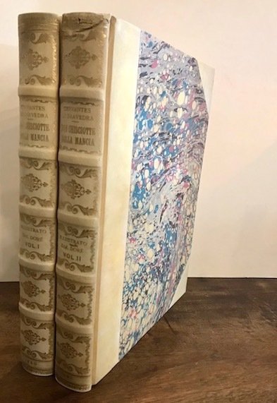 Folio (cm. 36,8), 2 Voll., 3 cc.nn., 414 pp.; 3 cc.nn., 458 pp. Frontespizi in rosso e nero. Eleganti legature ‘900 in mz. pergamena con angoli. Nervi, fregi e titoli impressi in oro al ds. Carte dei piatti e delle sguardie marmorizzate in modo omogeneo. Ex libris di collezione privata ai contropiatti. Lievi diffuse fioriture dovute alla qualità della carta, peraltro esemplare in ottimo stato di conservazione. Prima edizione italiana del capolavoro di Cervantes magistralmente illustrato da Gustave Doré. Non comune.