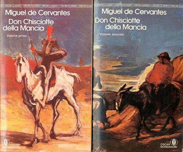 2 v. (LXVII, 1441 p.) ; 19 x 11 cm. Oscar classici, 57/58. Il primo grande romanzo dell'età moderna in edizione integrale nella traduzione e nella cura di Vittorio Bodini (Titolo originale dell'opera: «El ingenioso hidalgo Don Quijote de la Mancha»), considerata ancora oggi un modello di limpidezza per la linearità con cui restituisce il lucido smalto della prosa di Cervantes, e al tempo stesso di arguzia, per la resa esemplare di bisticci, battute e proverbi. L'opera è divisa in due parti, composte a grande distanza di anni tra loro. In un borgo della Mancia vive un povero hidalgo che, totalmente assorbito dalla lettura di romanzi cavallereschi, impazzisce e decide di farsi cavaliere errante. Datosi il nome di Don Chisciotte, scelta come dama una vicina che battezza Dulcinea, parte sul suo ronzino che chiama Ronzinante. Dopo numerose avventure finite male, preso come scudiero Sancho Panza, ritorna al villaggio. Riparte ben presto e si susseguono incontri e vicende che si concludono con un duello che Don Chisciotte perde e che lo vede costretto a tornare al villaggio. Cade ammalato e rinsavisce di colpo, ma dopo aver preso congedo dai suoi vecchi amici, muore. A cura di Cesare Segre e di Donatella Moro Pini; traduzione di Ferdinando Carlesi. Nelle copertine: Don Chisciotte e Sancio Panza visti da Honoré Daumier. Brossura editoriale, coperta illustrata a colori in cartoncino flessibile plastificato lucido. Codice libreria 6464.