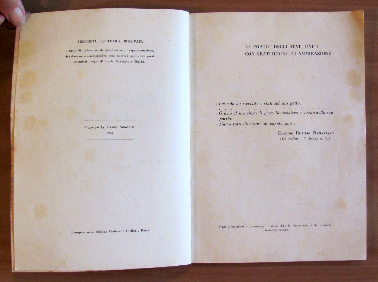 Tragicommedia in Tre Atti e Sette Quadri. Simpatica illustrazione alla copertina. Copyright Simoncini, I edizione 1953 . Stampato nelle Officine Grafiche Apollon - Roma. Brossura editoriale con lievissime bruniture del tempo ai risguardi e alla prima e ultima pagina. 17x24; pp.77. Raro e in Ottimo stato. , Ottimo (Fine)
