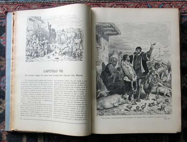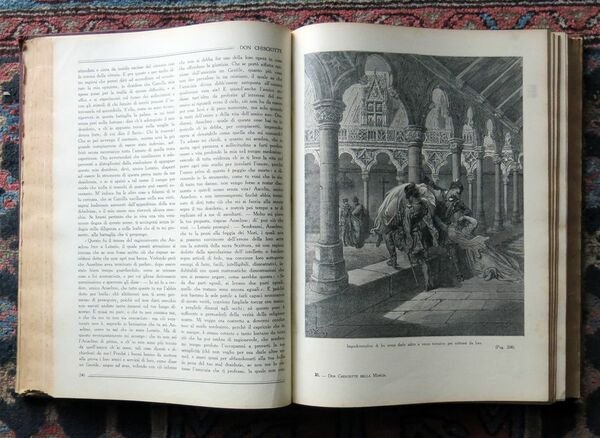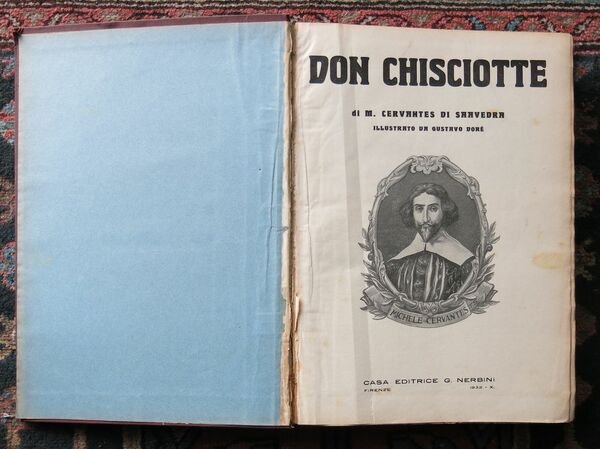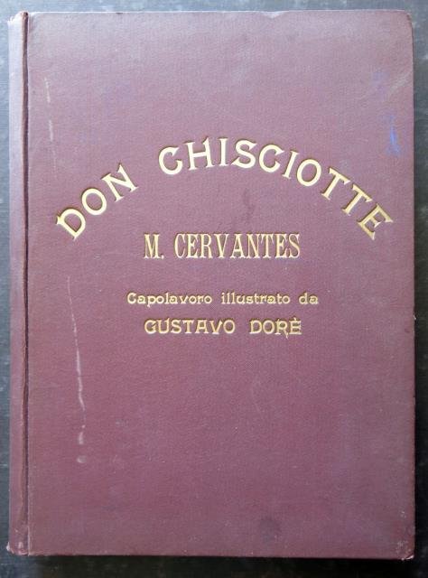 Casa Editrice G. Nerbini, Firenze, 1932. Illustrato da Gustavo Dorè. In folio (cm 25 x 34), front. con ritratto del Cervantes, diviso in LXXII capitoli, pp. 808 (con Indice dei Capitoli), contropiatti e fogli di guardia in carta azzurrina, leg. in t. percallina bordeaux con titoli oro al piatto. Si è sciolto il frontespizio, alcuni sporadici e leggeri aloncini di ingiallimento, macchie di bianco alla copertina posteriore, molto buono e con pagine assolutamente fresche l'interno con le belle incisioni. .
