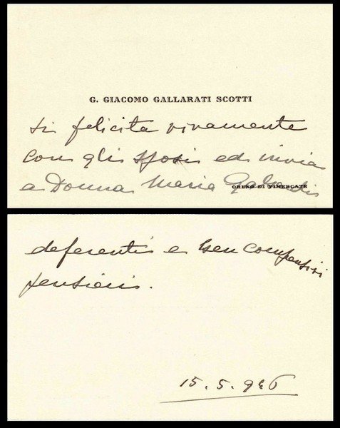 *Don Gian Giacomo Gallarati Scotti dei Principi di Molfetta (Vimercate, 1886 – Venezia, 1983). Politico italiano e Senatore del Regno. Biglietto da visita manoscritto.