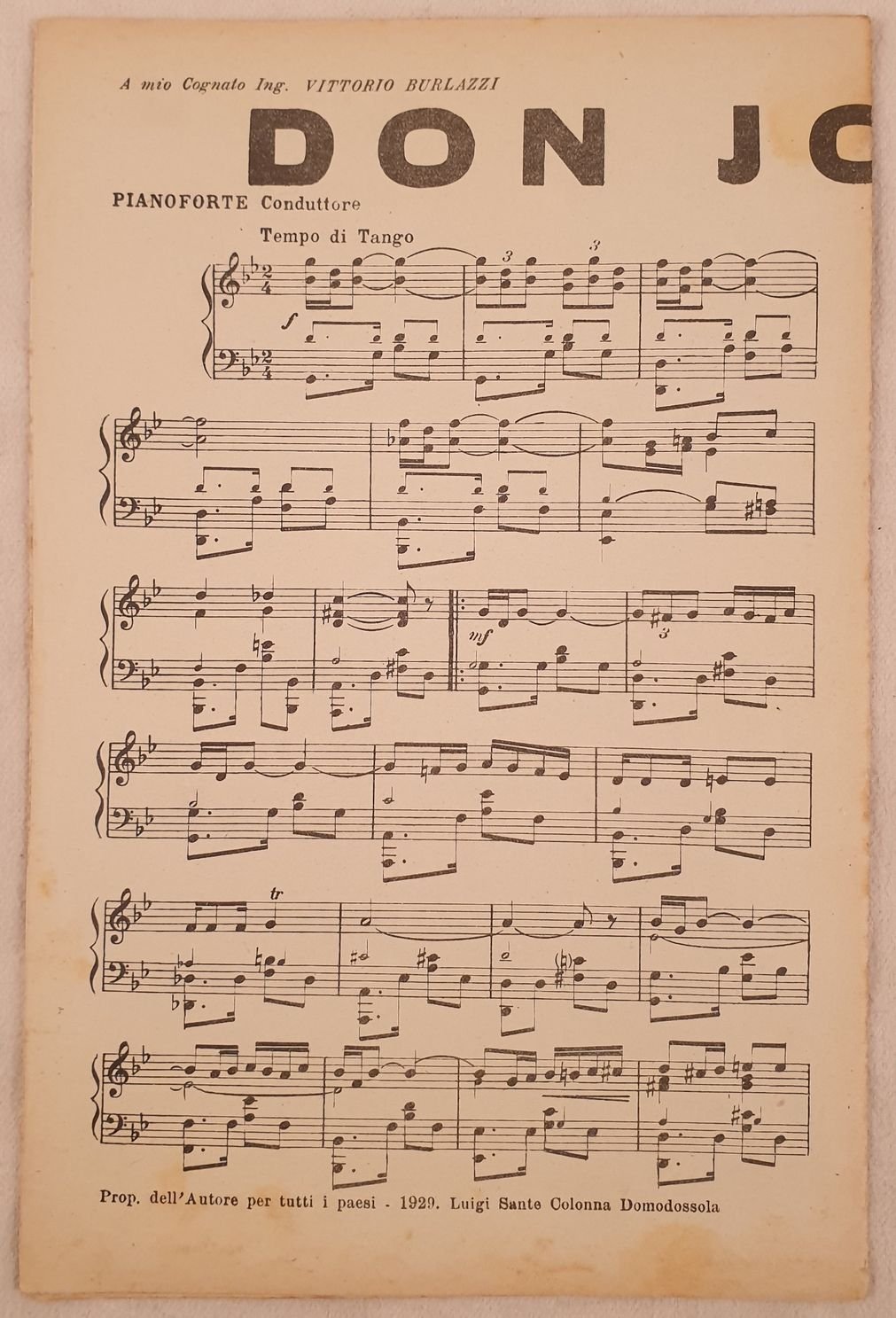 Bello spartito, partitura completa per orchestra del 1929 di due canzoni.<BR>Copertina mancante. Ex libris in qualche pagina GENERE: Tango TRUMENTI: pianoforte violini violoncello tromba/clarino contrabasso flauto sassofono<BR>ANNO: 1929 NOTE: In 4. cm 27x17,5. pp. 18. Buone condizioni. Beautiful score of two songs a complete score for orchestra of 1929. Cover is missing. Ex libris in some page MUSIC: Tango INSTRUMENTS: piano violins violoncello trumpet/clarion contrabass flute saxophone YEAR: 1929 NOTES: In 8. cm 27x17,5. pp. 18. In good conditions. <BR><BR>