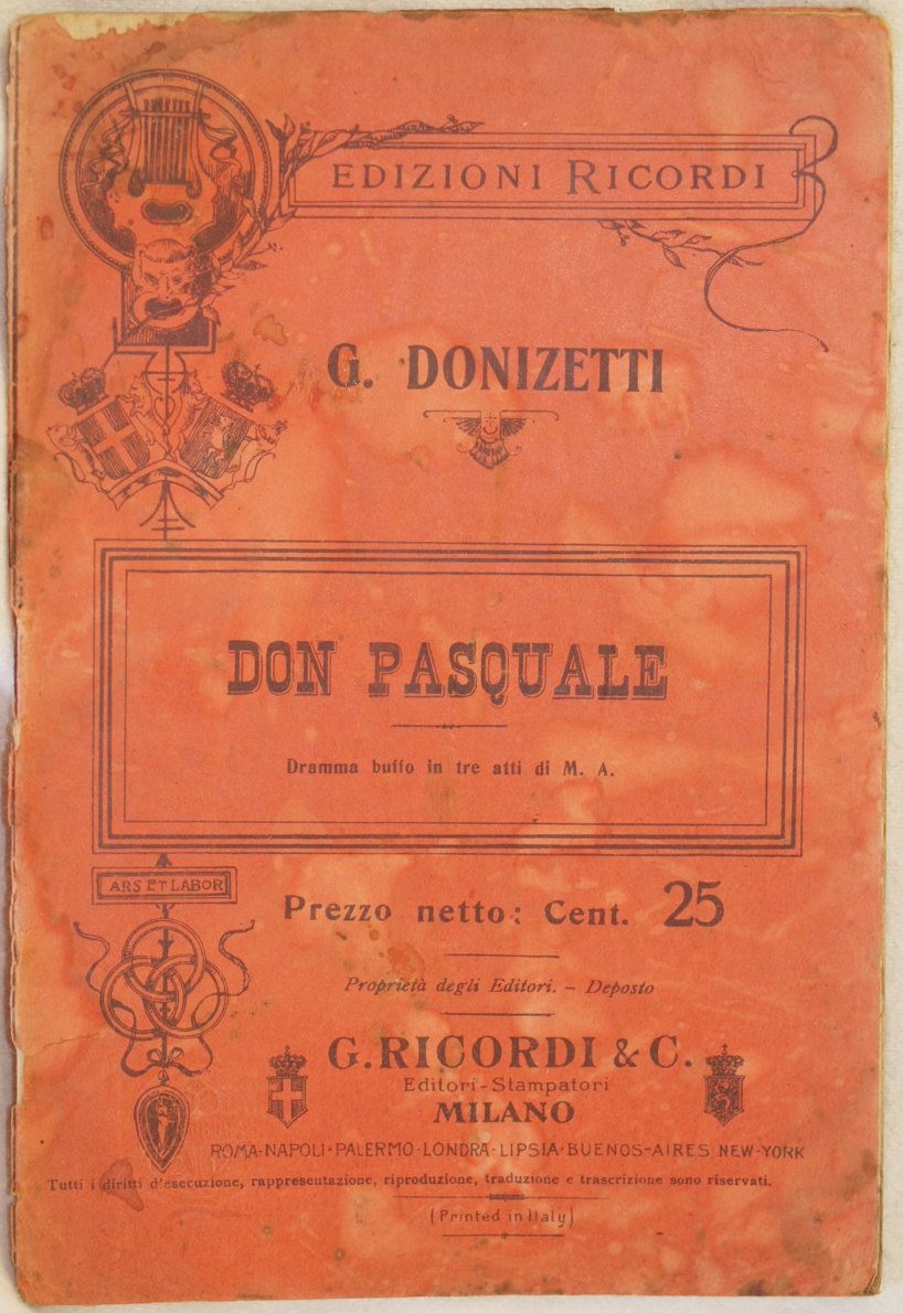 In 16. Dim. 20x13,5 cm. Pp. 32. Bel libretto d'opera del febbraio 1912 dell'opera dramma buffo in tre atti "Don Pasquale" di Gaetano Donizetti (1797-1848). La prima rappresentazione ebbe luogo al Theatre Italien di Parigi il 3 Gennaio 1843 In discrete condizioni. Bella brossura editoriale illustrata. Brossura editoriale in buone condizioni generali con lievi usure ai margini e dorso; macchie. Piatto anteriore quasi staccato. Legatura in buone condizioni. All'interno le pagine si presentano in buone condizioni con fioriture. Macchie al frontespizio. Beautiful booklet of february 1912 of the work in three acts "Don Pasquale" by Gaetano Donizetti (1797-1848). The first representation took place in the Theatre Italien in Paris the 3rd of January 1843. In good conditions. Illustrated editorial cover. Editorial cover in fair general conditions slightly worn in the edges and spine; stains. Front plate almost detached. Binding in good conditions. Inside pages are in good conditions with foxings. Stains in the title page.