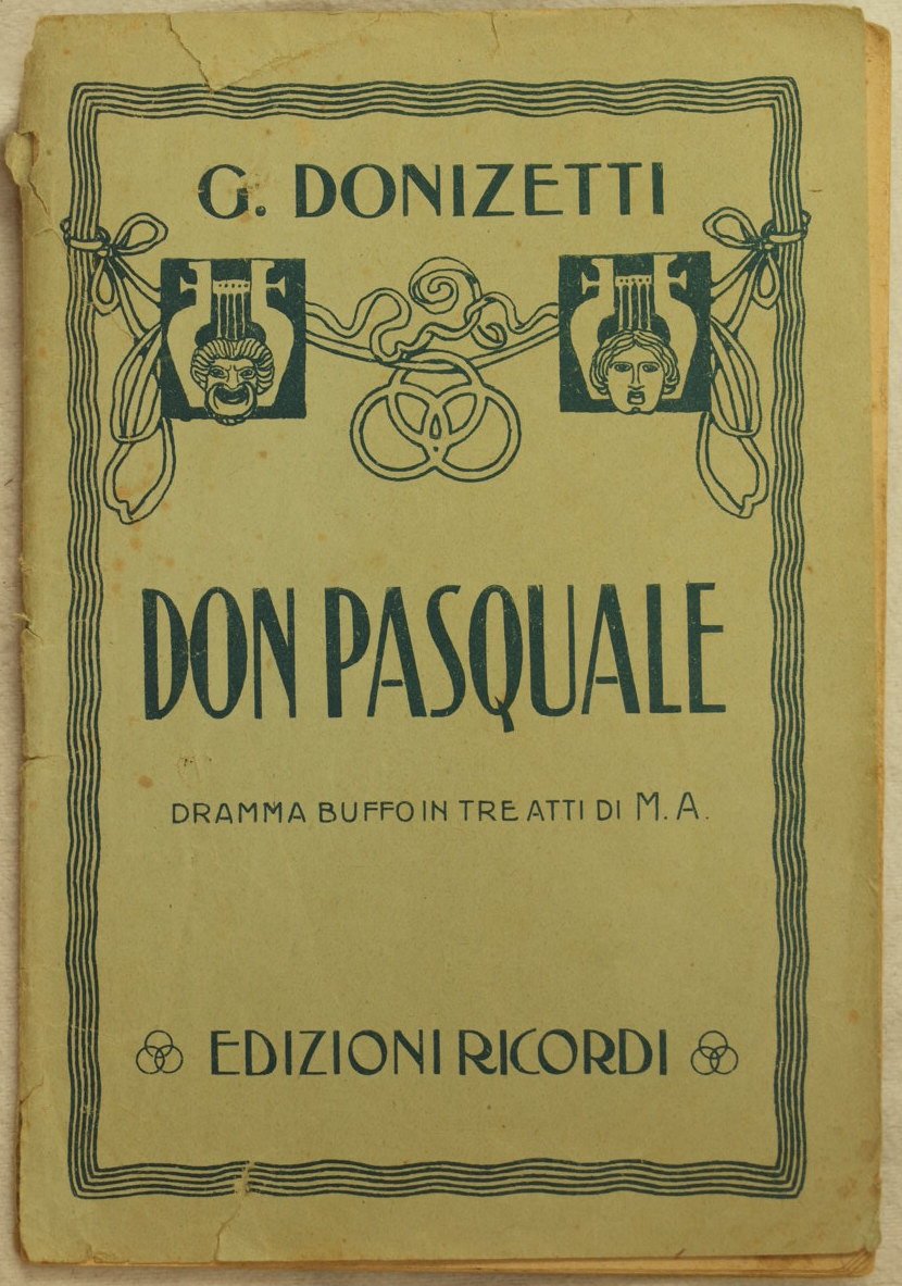 In 16. Dim. 18,5x13 cm. Pp. 32. Bel libretto d'opera degli anni '30 dell'opera dramma buffo in tre atti "Don Pasquale" di Gaetano Donizetti (1797-1848). La prima rappresentazione ebbe luogo al Theatre Italien di Parigi il 3 Gennaio 1843. In buone condizioni. Bella brossura editoriale illustrata. Brossura editoriale in buone condizioni generali con lievi usure ai margini e dorso; macchie. Legatura in buone condizioni. All'interno le pagine si presentano in buone condizioni con fioriture. Beautiful booklet of 1930's of the work in three acts "Don Pasquale" by Gaetano Donizetti (1797-1848). The first representation took place in the Theatre Italien in Paris the 3rd of January 1843 In good conditions. Illustrated editorial cover. Editorial cover in fair general conditions slightly worn in the edges and spine; stains. Binding in good conditions. Inside pages are in good conditions with foxings.