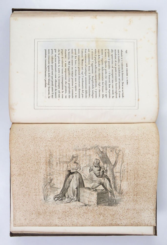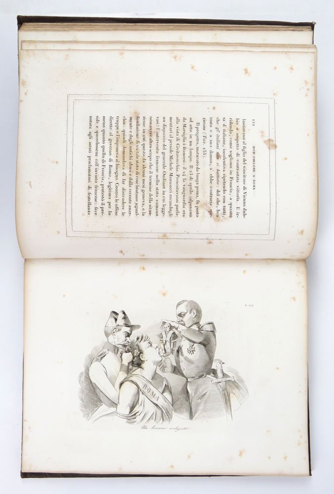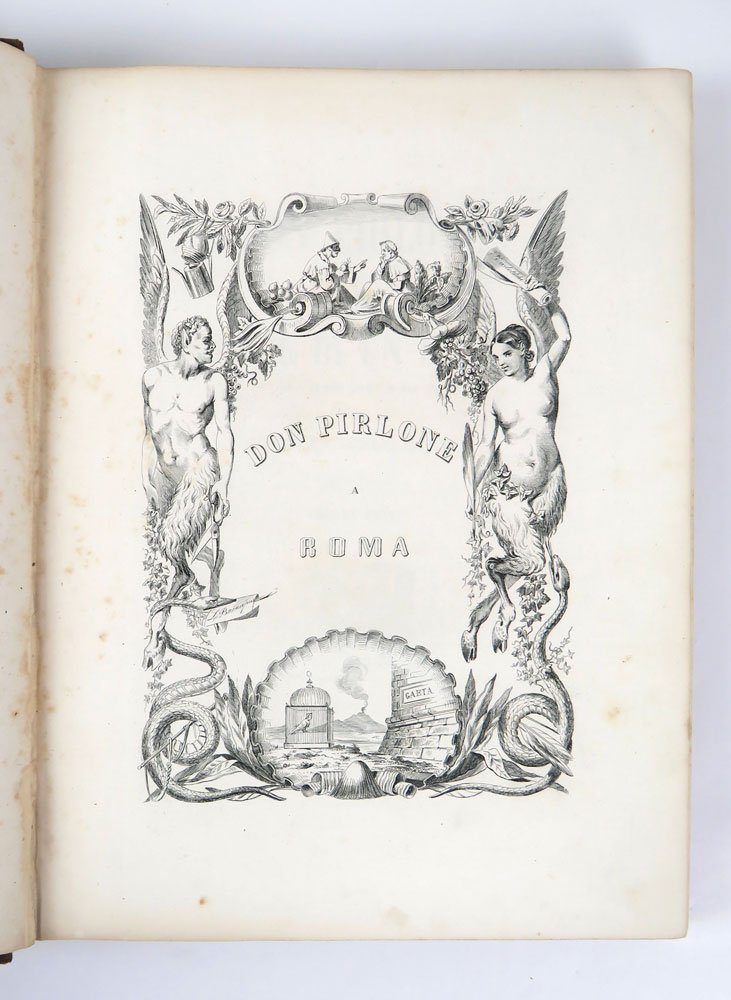 LIBROPrima edizione.Qualche fioritura per la qualità della carta, ma ottimo esemplare a grandi margini.L'autore, già comproprietario e articolista del "Don Pirlone Giornale di caricature politiche", caduta la Repubblica Romana, fuggì a Torino dove pubblicò la presente opera, mantenendone lo stile satirico che aveva fatto la fortuna del giornale romano. Prima edizione, non comune.Cfr. Inventario Raccolta Bertarelli "Risorgimento Italiano", I, 6395