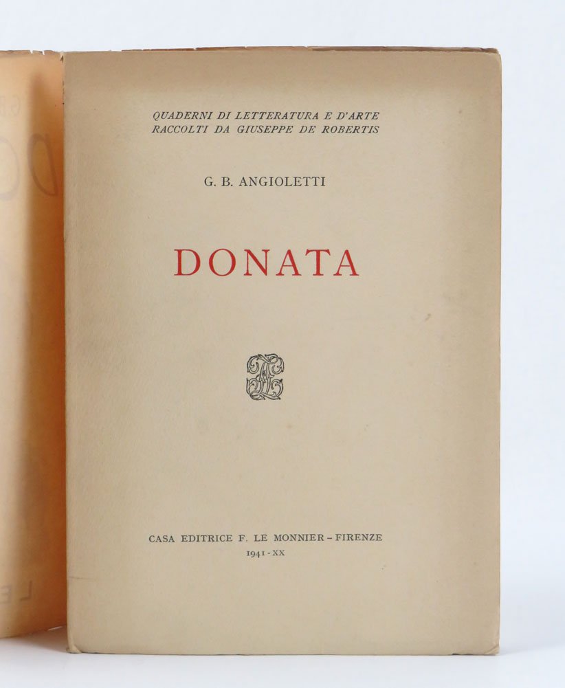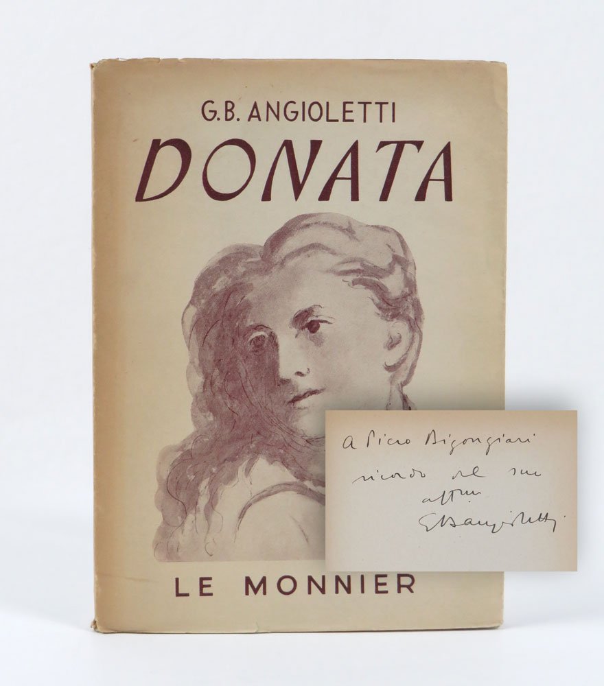 LIBROPrima edizione.CON AUTOGRAFO.L’esemplare di Piero Bigongiari, pregiato dalla dedica autografa dell’autore. In ottime condizioni, nella tiratura fuori commercio.Narrazione che la critica ha assimilato a un poemetto in prosa (benché Angioletti abbia sempre respinto questa definizione). In «Donata» si intrecciano «svolgimenti tra il lirico e il fantastico di motivi e figure simboliche e mitiche, in cui il registro stilistico attingeva a tutti i modi della possibilità evocativa e allusiva della parola e della costruzione sintattica, per rendere un’atmosfera rarefatta e sospesa, carica di echi etici, spirituali e religiosi» (Strappini, DBI).