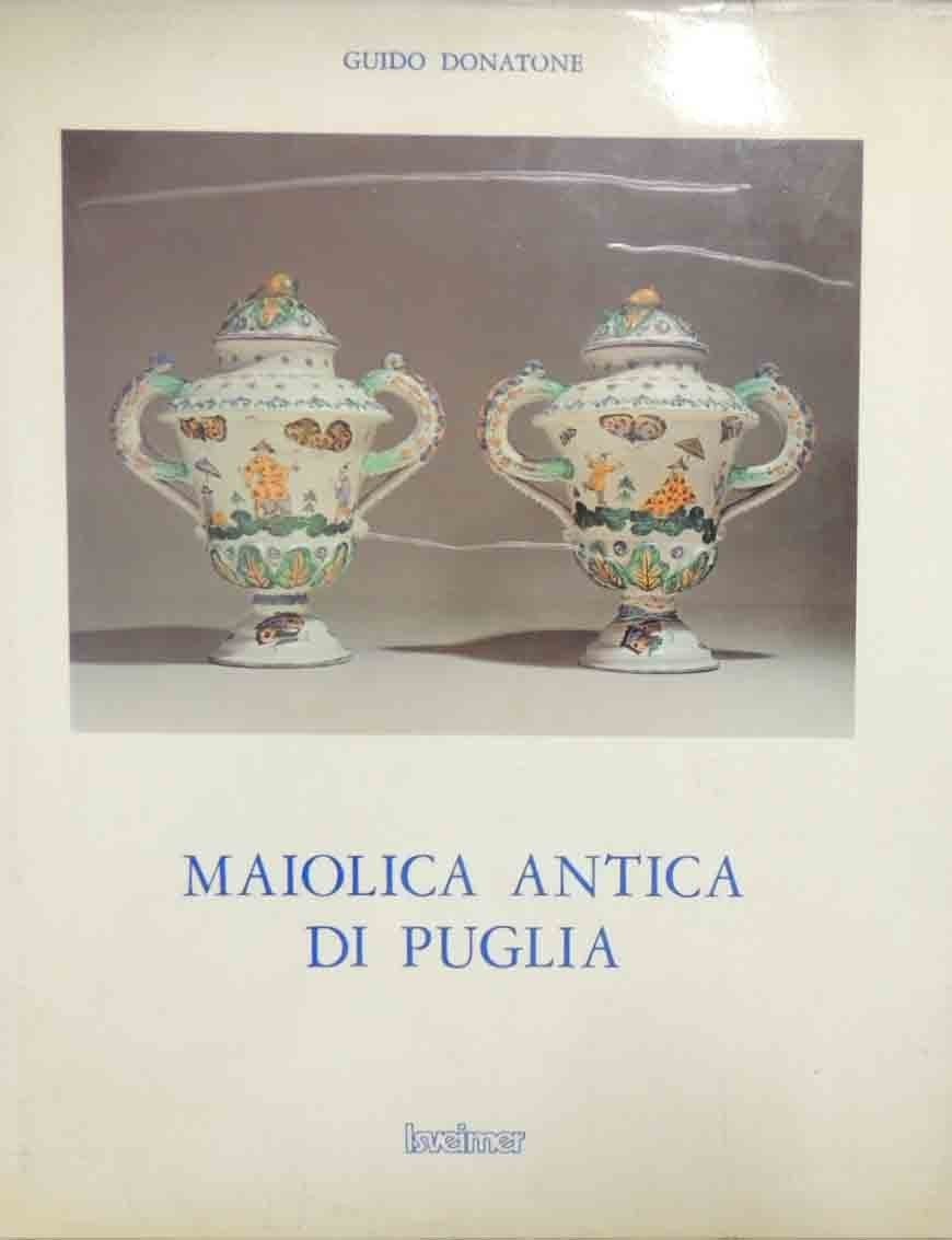 Guido Donatone, Maiolica antica di Puglia, Isveimer, s.l. (ma stampata a Cava dei Tirreni, presso le Arti Grafiche Emilio Di Mauro S.p.A.) 1971, pp. 71, 43 c. di tavv. f.t. ill. b.n. e col., similtela ed. con titoli in oro al dorso e al piatto e sovraccoperta. Edizione in 1000 esemplari fuori commercio realizzata per l’Isveimer, Istituto per lo Sviluppo Economico dell’Italia Meridionale, in occasione della inaugurazione della nuova sede di Bari dell’Uffiocio Puglia, il 29 giugno 1981. Leggere tracce d’uso alla sovraccoperta, minime ingialiture ai margini, per il resto ben conservato.