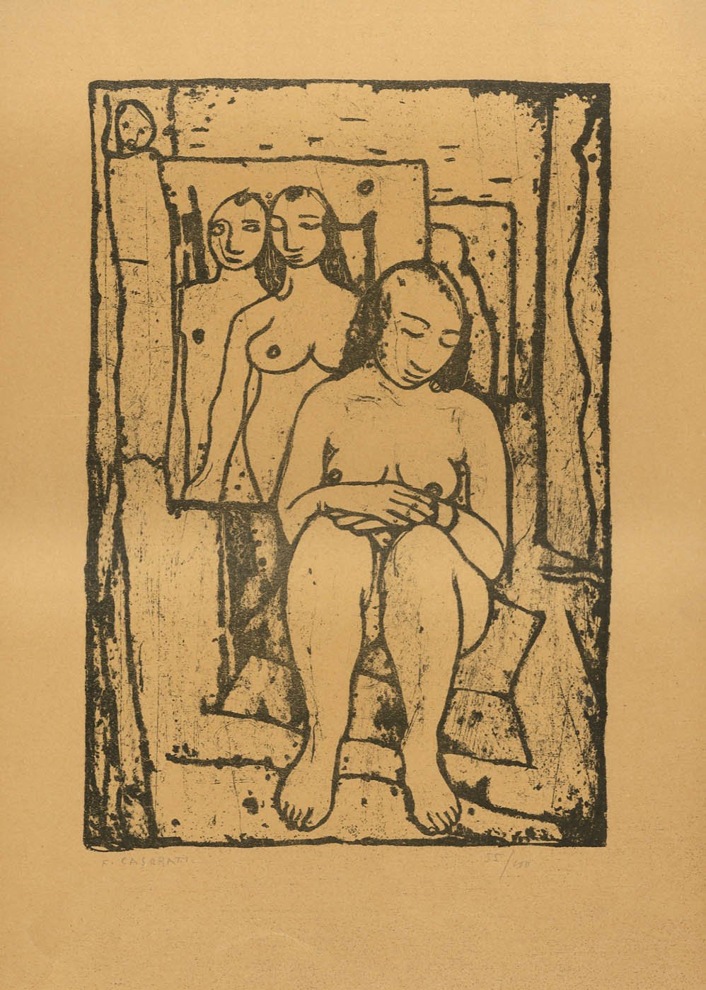 >Litografia originale (mm 500x350 ca) con la firma autografa a lapis "F.Casorati" in maiuscola a sinistra del margine inferiore, e la numerazione "55/100" a destra. Una delle dieci litografie stampate al torchio a mano, serie tirata a 100 esemplari e le lastre poi levigate. Tutte le litografie della serie sono accomunate dal tema del nudo, uno dei classici temi accademici, benché Casorati avesse frequentato legge e non l'accademia. L'attenzione al corpo umano, molto spesso nella sua nudità, rappresenta uno dei motivi da lui più analizzati lungo tutto l'arco della sua vita creativa. "il nudo di donna diviene una presenza quasi ossessiva e reiterata all'interno del suo operare; è simbolo di una ricerca e razionale ... il motto Numerus, mensura, pondus, che nella sua brevità ci da forse il ritratto intimo più aderente dell'uomo e dell'artista, aiutandoci anche nel reperire la chiave di lettura necessaria per decodificare l'attitudine mentale del suo fare pittura ... propone regole matematiche nella costruzione del corpo ... che Casorati ben conosce e utilizza quasi come schemi mentali per costruire le sue figure all'interno dello spazio dello studio o di una stanza" (Claudia Gianferrari). Impresse subito dopo la guerra, queste litografie sono rare e si trovano spesso su carte di diverse grammature e tonalità a causa della scarsa reperibilità della materia prima nel periodo postbellico. CARLUCCIO 1964 p. 304; Carluccio, Opera Grafica, n. 51.