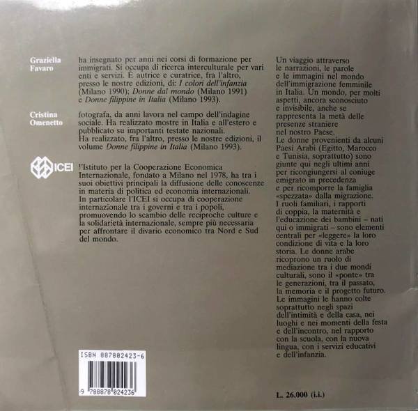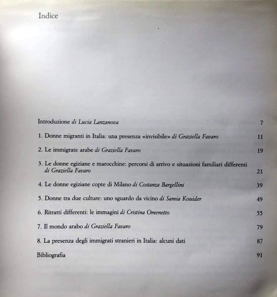 Soggetti: Multiculturalismo, Emigrazione, Immigrazione, Donne immigrate, Condizioni economiche e sociali, Società, Accoglienza, Politica, Integrazione, Razzismo, Cultura, Donne arabe, Islam, Radicalismo islamico, Ruolo femminile, Città, Metropoli, Lavoro, Famiglia, Diritti sociali, Religione, Società multietnica, Vita quotidiana, Bambini, Scuola, Tradizioni culinarie, Cucina, Egiziani, Marocchini, Egitto, Marocco, Figli, Matrimoni misti, Fotografia, Libri illustrati, Biografie, Ritratti, Viaggio, Comunità, Stranieri, Tunisia, Migrazioni, Cittadinanza, Medio Oriente, Siria, Le donne egiziane copte di Milano, Libri Vintage, Fuori catalogo, Fotografie, Mujeres musulmanas, Musulmani, Bibliografia, Arab countries, Femmes arabes, Italie, Conditions sociales, Emigration, Immigration, Aspect social, Mondo arabo, Educazione, Pedagogia, Violenze, Women in Global Migration, Infanzia, Lingua, Apprendimento, Solidarietà, Multietnicismo, Commercio, Corsi di formazione, Attualità, Reportage, Statistiche, Presenza, Multiculturalism, Emigration, Immigration, Immigrant women, Economic and social conditions, Society, Hospitality, Politics, Integration, Racism, Culture, Arab women, Islamic radicalism, Female role, City, Metropolis, Work, Family, Social rights, Religion, Multi-ethnic society, Daily life, Children, School, Culinary traditions, Cuisine, Egyptians, Moroccans, Egypt, Morocco, Mixed weddings, Photography, Illustrated books, Biographies, Portraits, Travel, Community, Foreigners, Tunisia, Migrations, Citizenship, Middle East, Syria, Coptic Egyptian women of Milan, Books out of print, Photographs, Muslims, Bibliography, Arab world, Education, Pedagogy, Violence, Childhood, Language, Learning, Solidarity, Multi-ethnicism, Commerce, Training courses, News, Statistics, Presence