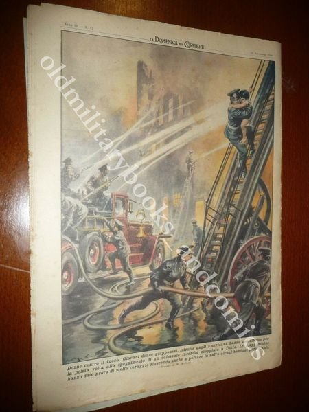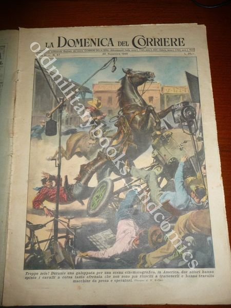 DESCRIZIONE: LA DOMENICA DEL CORRIERE 20 novembre 1949 n. 47 In copertina: Troppo zelo. Durante una ripresa cinematografica degli attori hanno spinto i cavalli travolgendo gli operatori cinematografici. Al retro: Donne contro il fuoco. Giovani donne giapponesi a Tokio combattono contro il fuoco. CONDIZIONI DELL'OGGETTO: Buone, con sovracc. azzurrina, con piccole pieghe. PESO/WEIGHT: 65 g without package