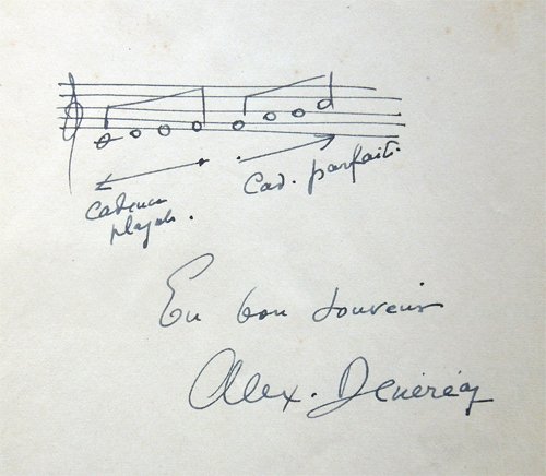 In-8° (26,4 x 18,5 cm), pp. (4), 219, (5), legatura coeva in tela blu, con fregi in oro al dorso. Normali tracce d'uso e del tempo alla legatura. Con moltissimi esempi musicali nel testo. Alla prima pagina bianca, dedica, con tutta probabilità, autografa firmata dell'autore (lo stesso tipo di firma, con il nome abbreviato, "Alex. Denéréaz", chiude la dedica che si trova in un esemplare del Cours d'harmonie conservato nella Zentralbibliothek di Zurigo, lascito Paul Müller-Zürich). Alle pagine 194-195, impressione lasciata da una foglia dimenticata all'interno del libro da vecchio proprietario. Normale, lieve patina del tempo alle pagine, per il resto, ben conservato. Alexandre Denéréaz (Losanna 1875-1947) fu un compositore, organista e musicologo svizzero. Tra i membri fondatori dell'Associazione dei musicisti svizzeri, a Losanna fu organista della chiesa protestante di Saint-François, professore d'organo e di teoria musicale al conservatorio e docente d'estetica musicale all'università. Table des matières. Cours d'harmonie. Introduction. Prélude. I. L'art harmonique. II. Données physiques. Première partie. III. La gamme. IV. L'accord et ses éléments. V. Les mouvements. VI. Le mouvement tonal. VII. Harmonie a trois voix. VIII. L'harmonie a quatre voix. IX. Les accords a quatre sons. X. Les quatre modes mineurs. XI. L'harmonie a cinq sons. XII. Accords a sons étrangers (d'origine contrapuntique): pédales. XIII. Accords (spéciaux) a sons surnuméraires. XIV. Les notes contrapuntiques Retards. Deuxième partie. L'harmonie pluritonale moderne. XV. L'accord de sixte augmentée. XVI. Altération et modulation. Troisième partie. XVII. L'harmonie complémentaire moderne. XVIII. La surharmonie. XIX. Le pandiatonisme. XX. Le chromatisme. Quatrième partie. Le choral. XXI. Le choral et l'unité tonale. Postlude.