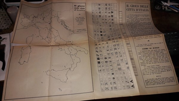 Grande foglio di cm. 83x61. Una metà raffigura la carta d'italia muta, l'altra raffig. 91 stemmi dei capoluoghi delle province d'Italia e una parte con le spiegazioni del gioco. (Gli stemmi andavano colorati, essendo doppi chiusi e incollati ad una spilla che servirà ad essere appuntata sulla carta preventivamente incollata su cartone e ad essere collocati nelle giuste province). Piccoli marginali strappetti al margine bianco esegni di piegatura.